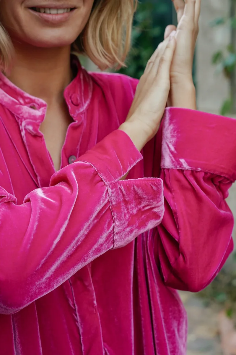 Une coupe ample associée à un tissu en 100% velours de soie pour un tombé fluide élégant.