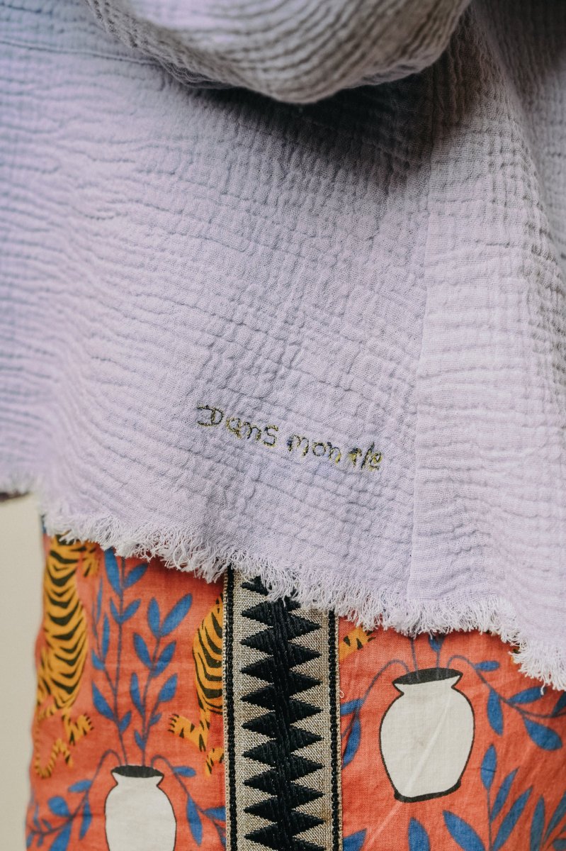La blouse présente une coupe ample et courte, des manches légèrement bouffantes resserrées aux poignets, ainsi qu’une rangée de boutons cuivrés permettant une ouverture totale. Son col mao est sublimé par une phrase brodée à la main en bas de la blouse : « Dans mon île ».