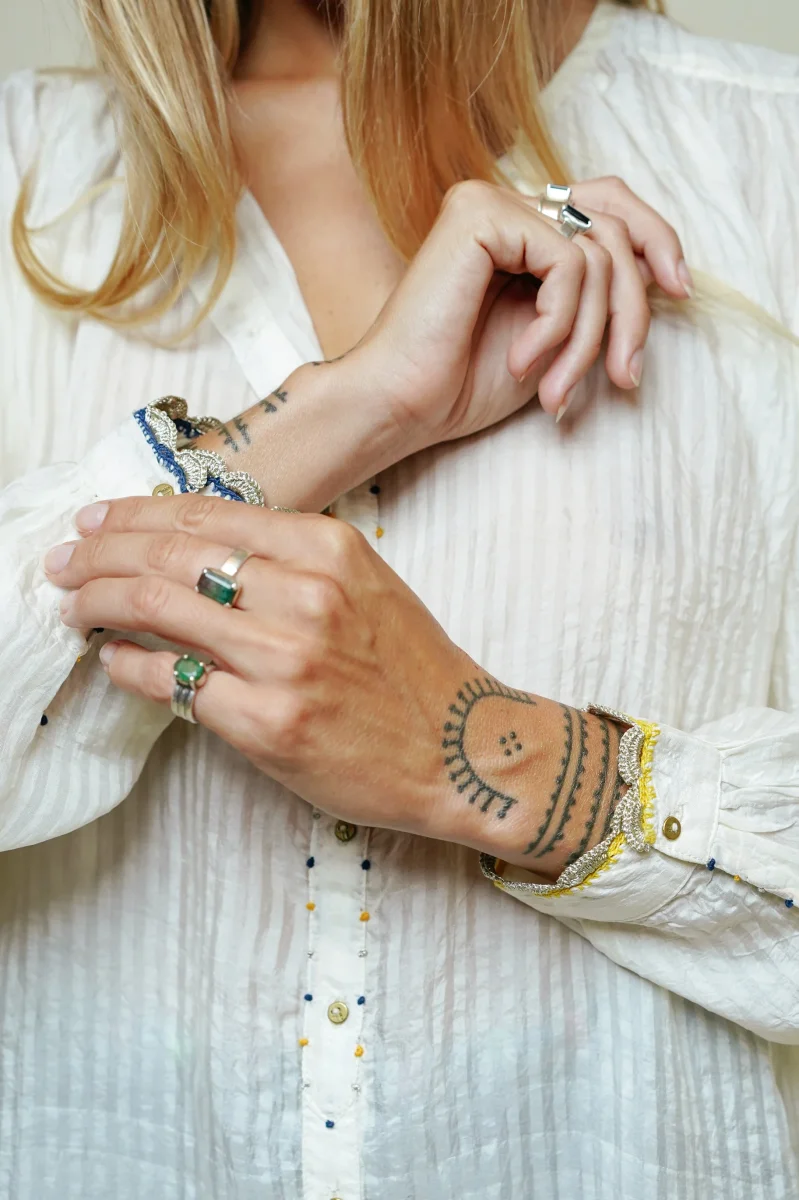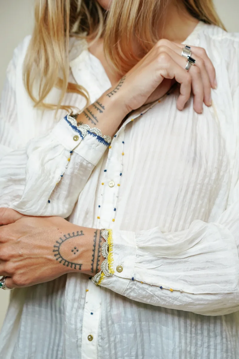Son col tunisien subtilement souligné par une broderie artisanale multicolore