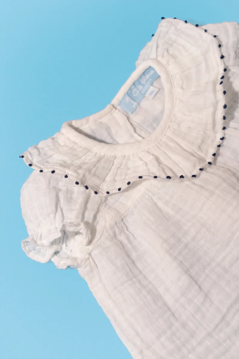 La jolie Lou en gaze de coton, aussi confortable que craquante. Les manches bouffantes, le col Claudine et la finition avec des points de couleur bleu finissent la blouse avec soin. La blouse s’enfile avec la plus grande aisance grâce à sa rangée de boutons dans le dos.