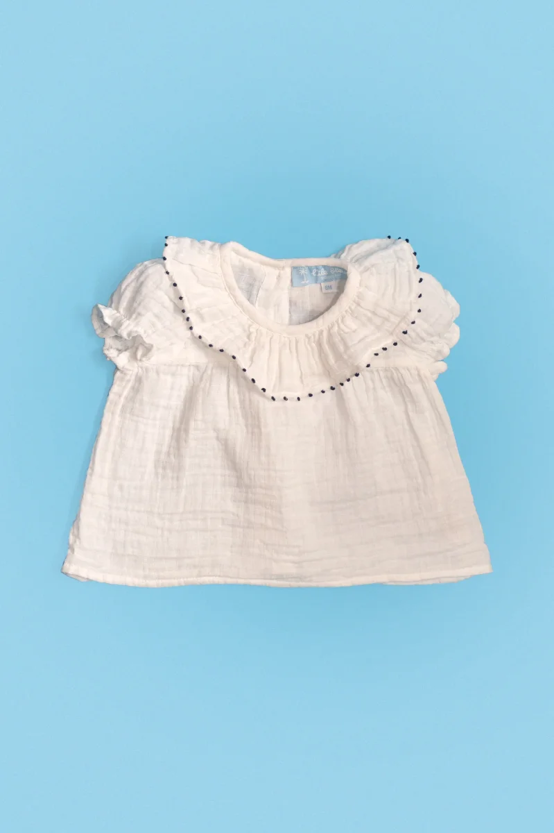 Les manches bouffantes, le col Claudine et la finition avec des points de couleur bleu finissent la blouse avec soin.