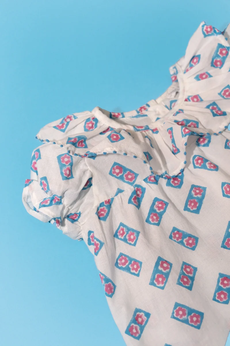 Les manches courtes bouffantes élastiquées, le col à volant et la rangée de boutons en nacre dans le dos font de Lou la pièce qui se glissera dans toutes les tenues de votre bébé.