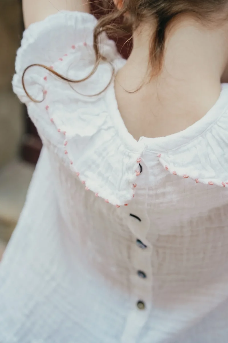 La jolie Lou en gaze de coton, aussi confortable que craquante. Les manches bouffantes, le col Claudine et la finition avec des points de couleur rose finissent la blouse avec soin. La blouse s’enfile avec la plus grande aisance grâce à sa rangée de boutons dans le dos.