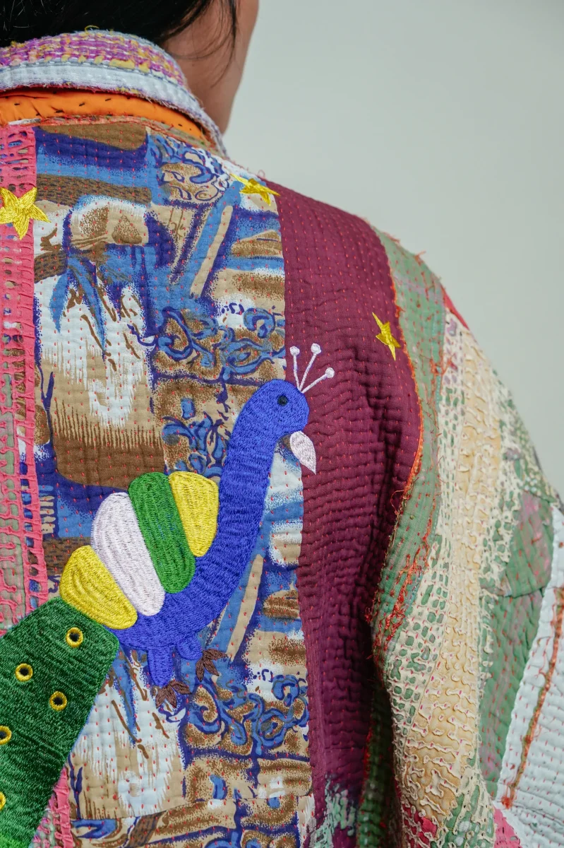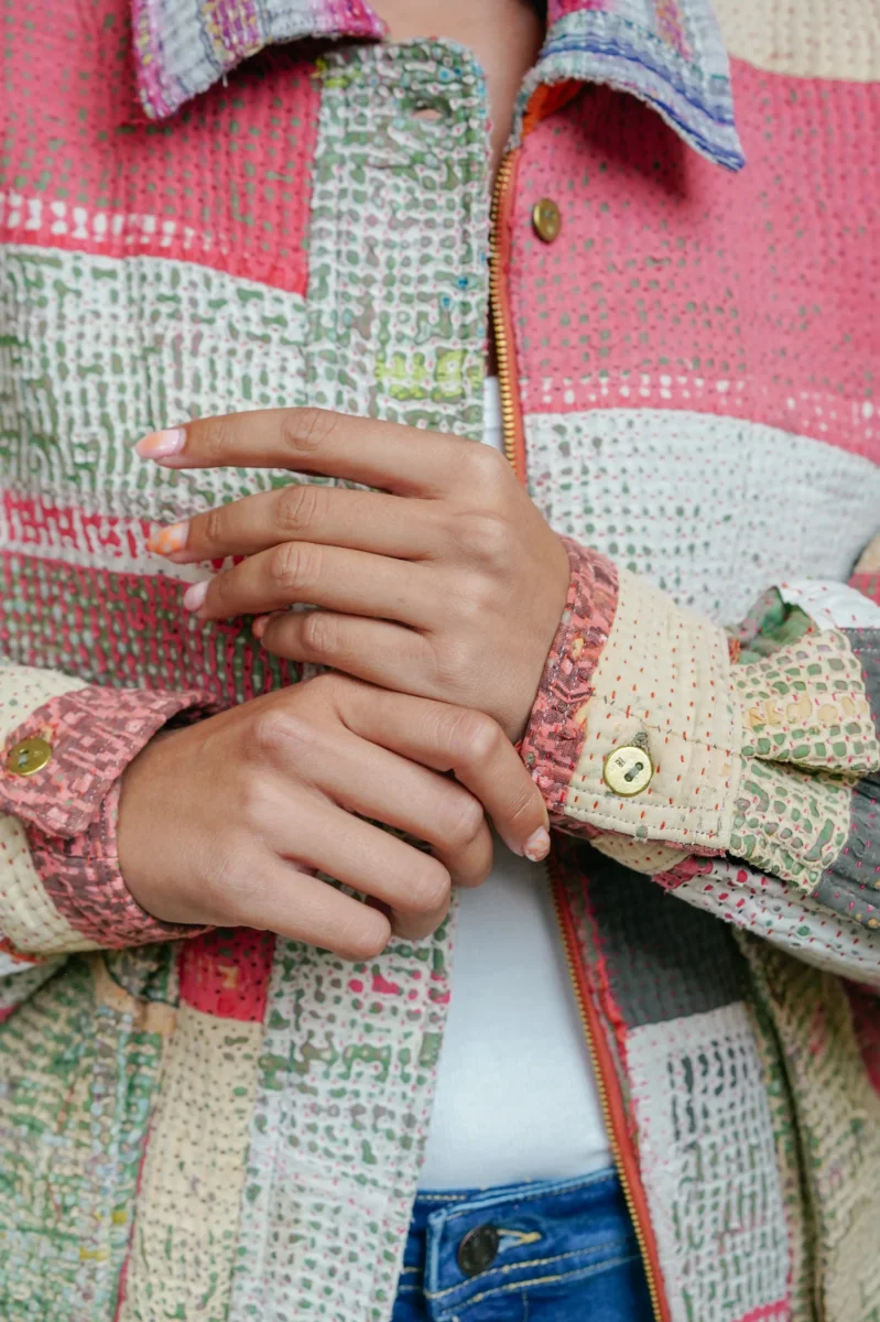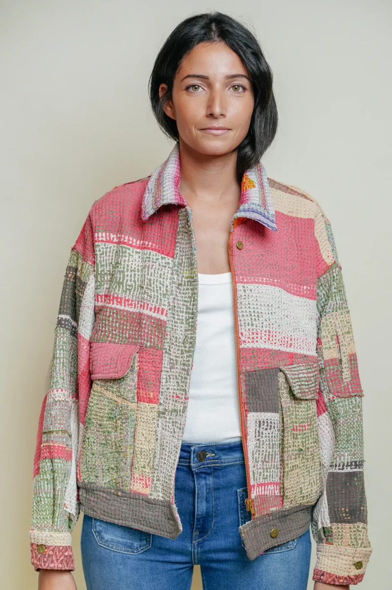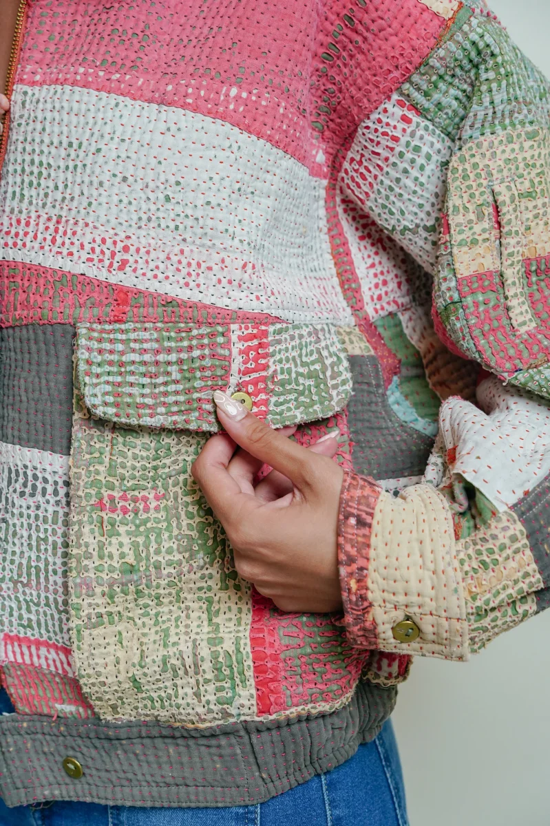 La veste est en 100% coton Kantha avec deux poches latérales, une poche cachée sur la manche gauche, une fermeture à zip et une languette avec bouton pour fermer le bas de la veste.