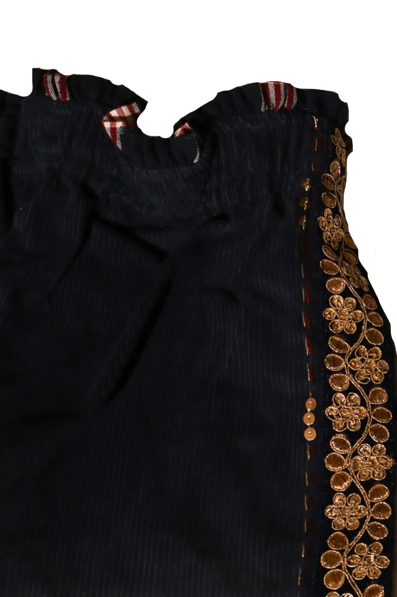 Plongez dans l’élégance L’Île Bleue avec notre boubou Bouchra, confectionné en velours côtelé bleu marine. Il se distingue par ses bandes latérales ornées de fleurs dorés, de ses broderies coeurs, lune et île sur les poches et sa ceinture double ruban.