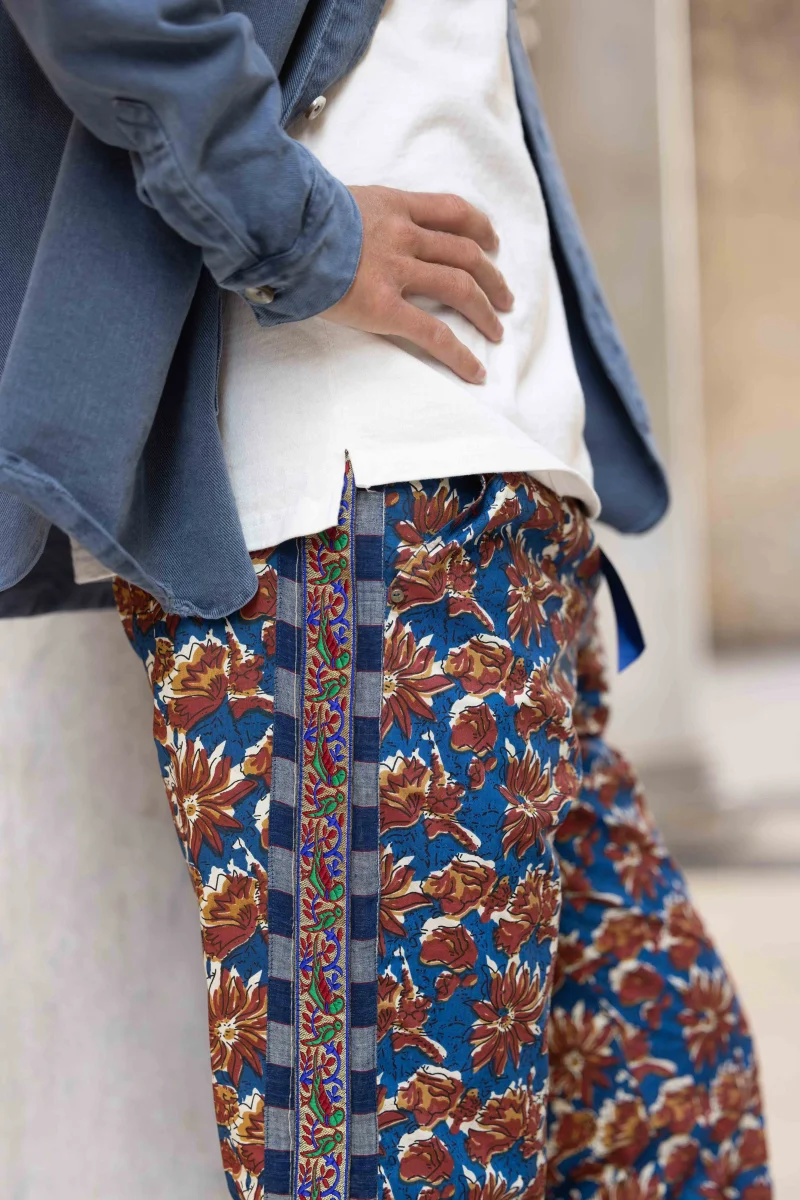 - Détail du revers en bas de jambe surpiqué dans un tissu différent