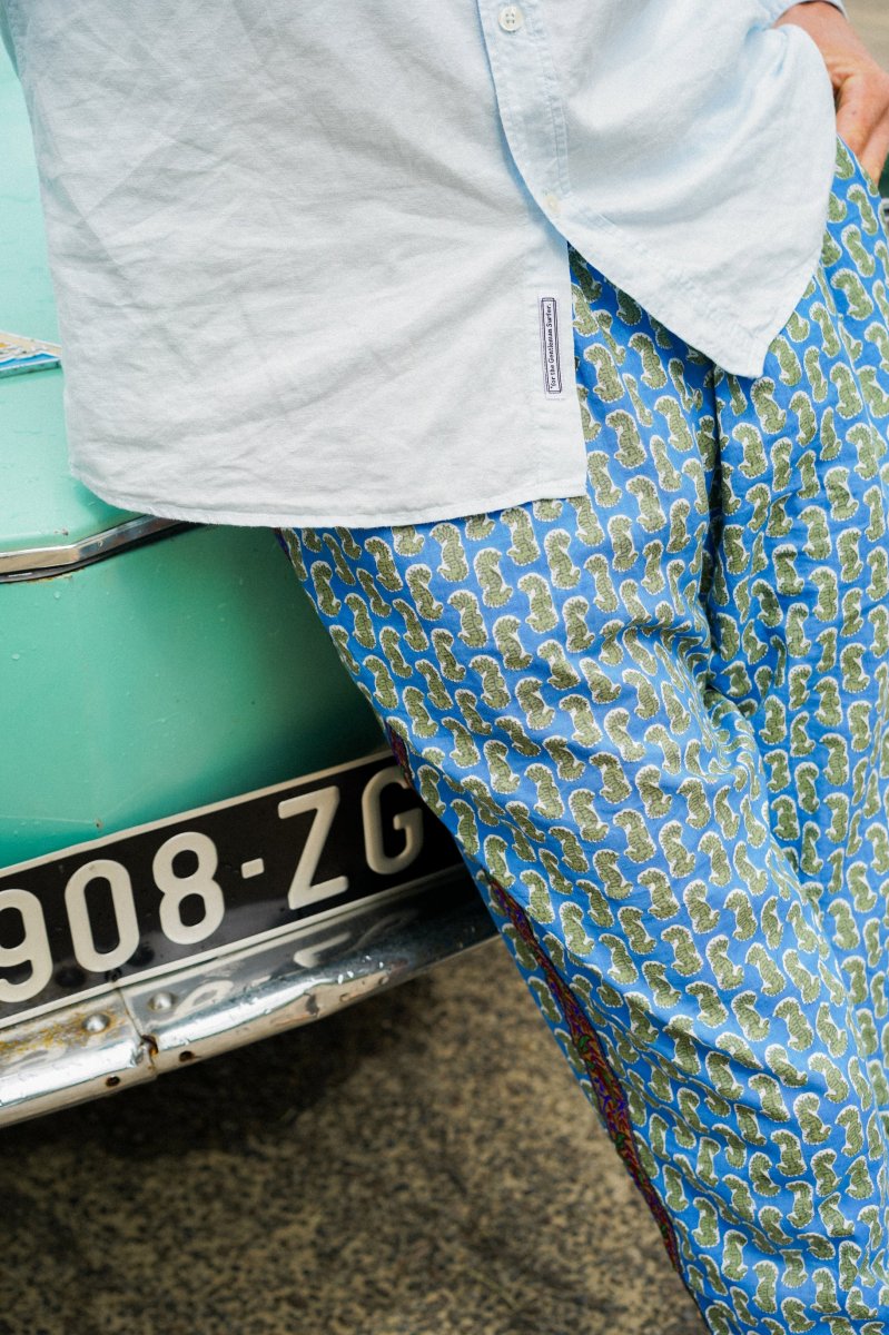 En faisant un revers, vous laisserez apparaître un ourlet dans un tissu vert utilisé pour le boubou Alexandre. Un cordon de serrage en satin vient se placer à la ceinture.