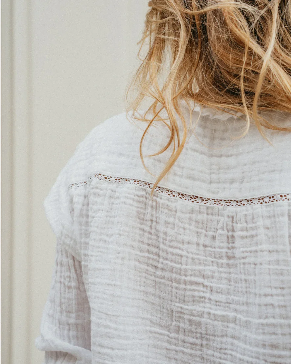 Création L’Île Bleue, la chemise en 100% gaze de coton est la pièce toute simple, toute belle qui va avec tout et dans laquelle on se sent bien.
