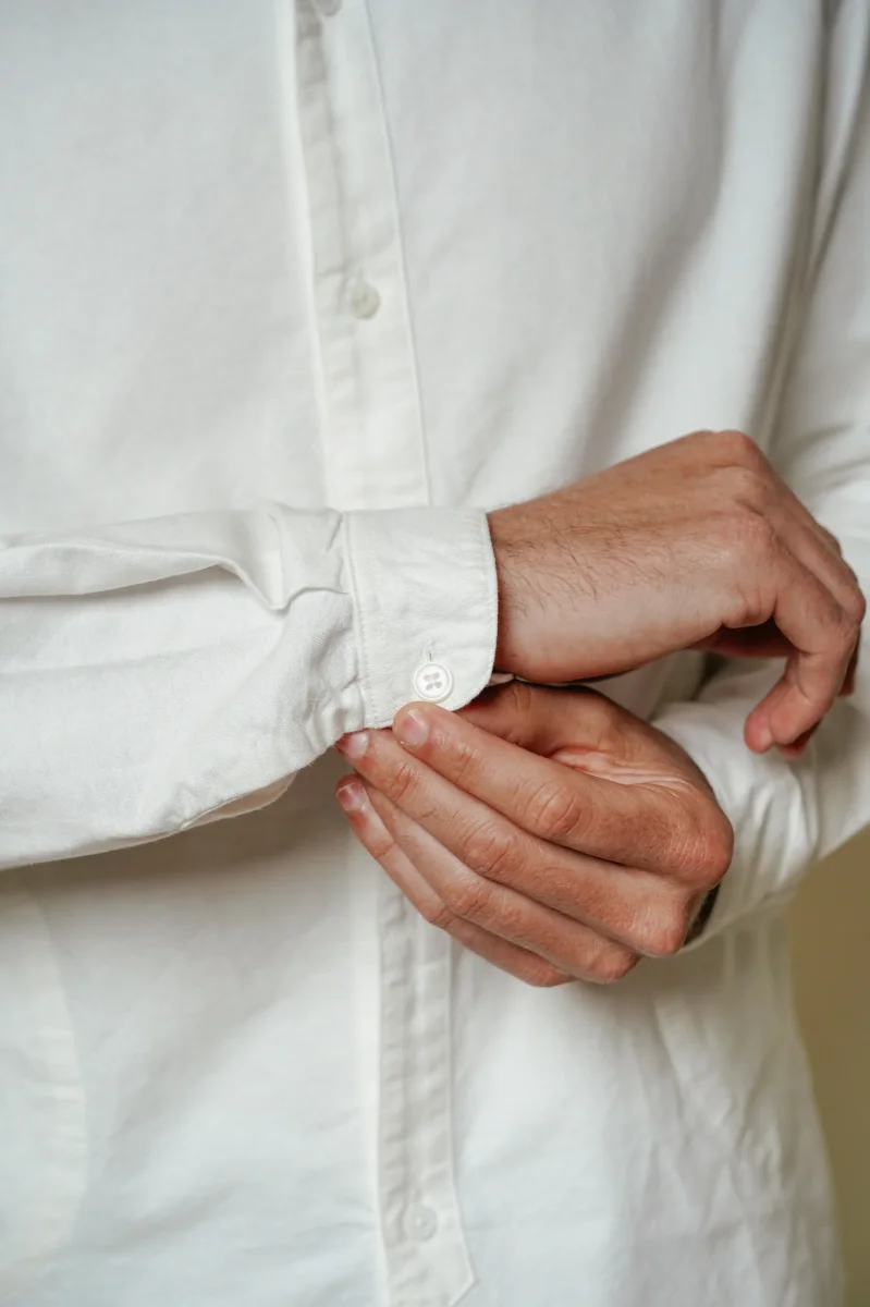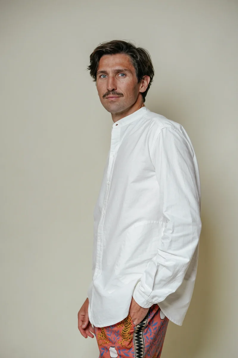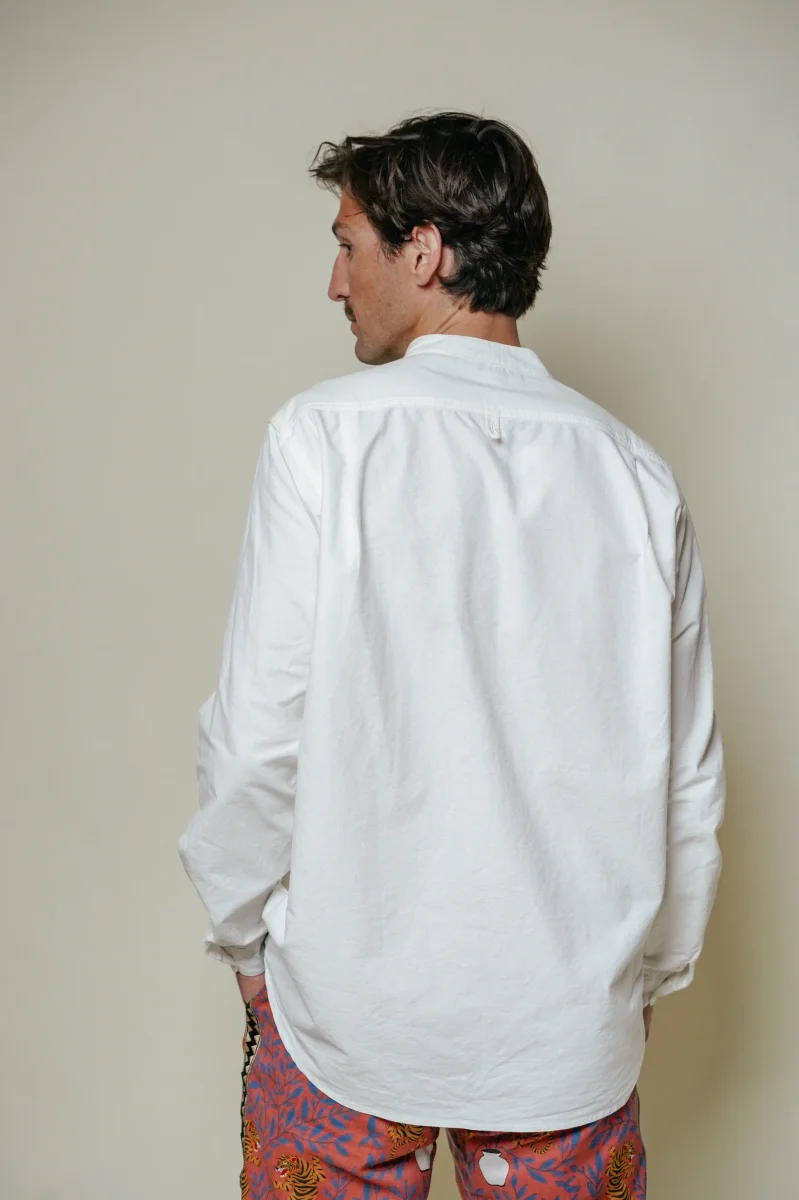 Manches longues, col mao avec une rangé de boutons nacrés pour fermer la chemise.