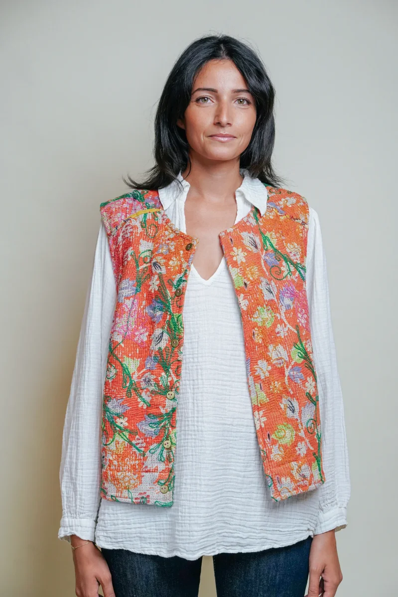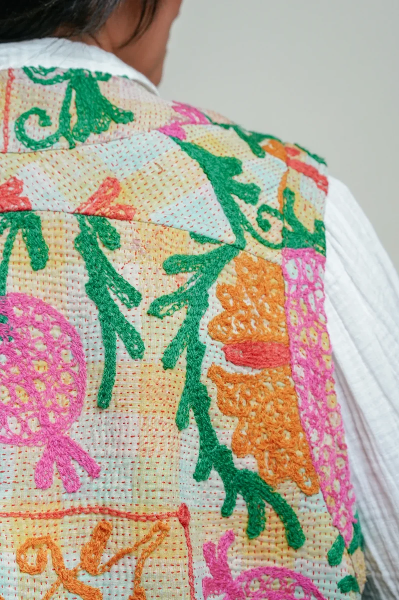 Le gilet Annie est une pièce rare qui célèbre le savoir-faire artisanal et l’élégance intemporelle. Imaginé à Bordeaux puis confectionné avec soin dans un atelier en Inde, il associe la richesse du Kantha – une technique traditionnelle de couture indienne – à la délicatesse des broderies Suzani, emblématiques d’Asie centrale.