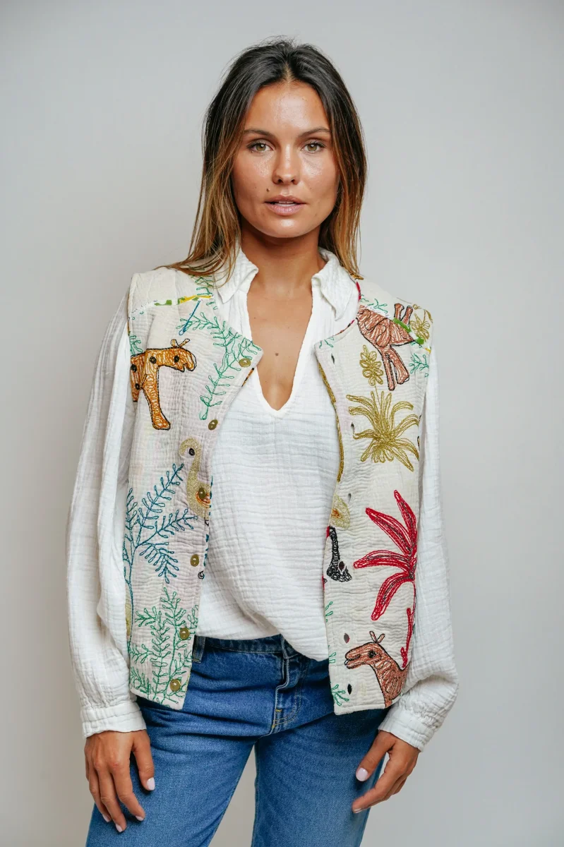Le gilet Annie est une pièce rare qui célèbre le savoir-faire artisanal et l’élégance intemporelle. Imaginé à Bordeaux puis confectionné avec soin dans un atelier en Inde, il associe la richesse du kantha – une technique traditionnelle de couture indienne – à la délicatesse des broderies Suzani, emblématiques d’Asie centrale.