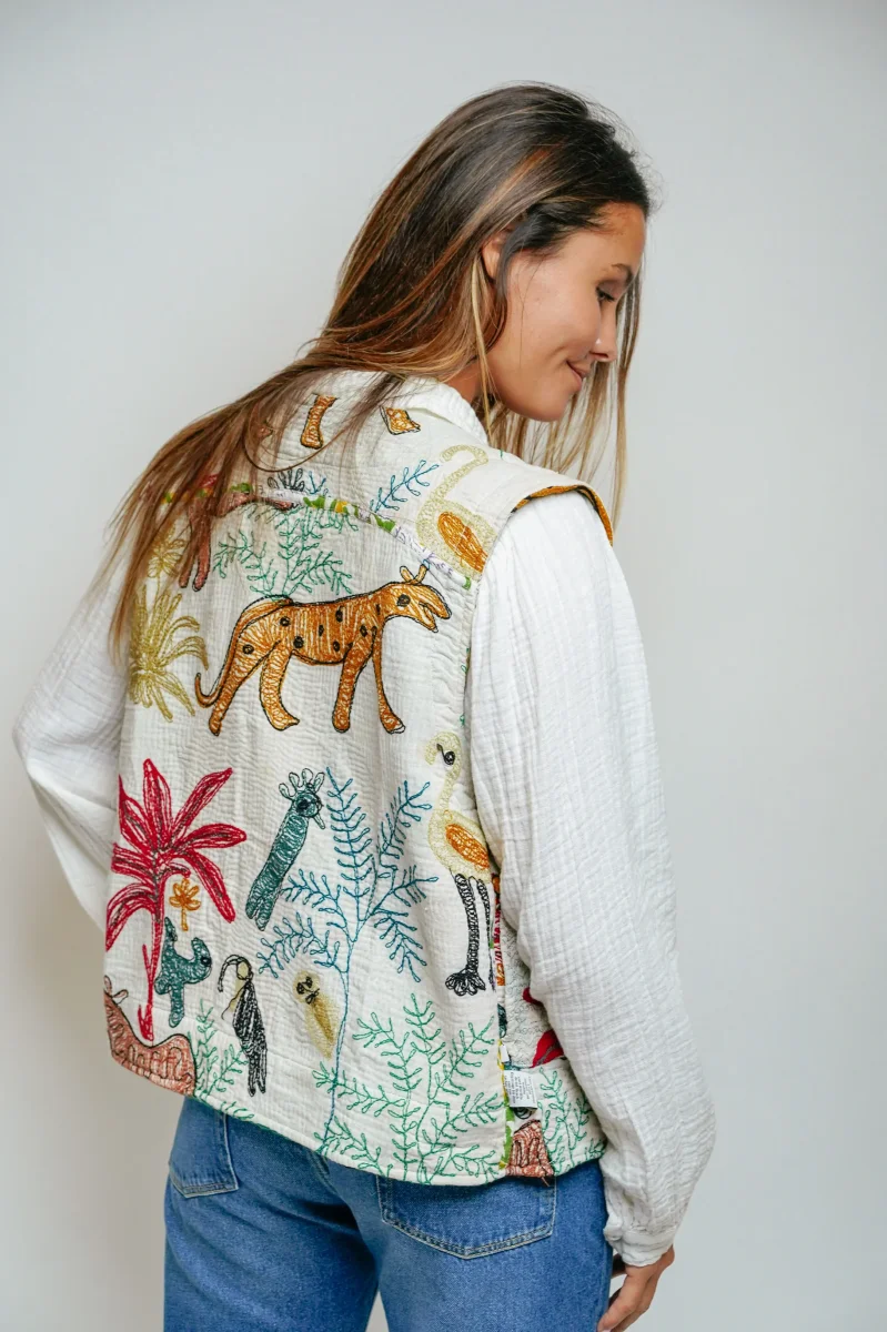 Réversible, il offre deux styles en un : un côté richement orné et coloré, l’autre plus sobre et texturé. Sa coupe sans manches en fait une pièce facile à superposer, aussi bien sur une robe fluide que sur un jean et un t-shirt, pour un look à la fois libre et affirmé.