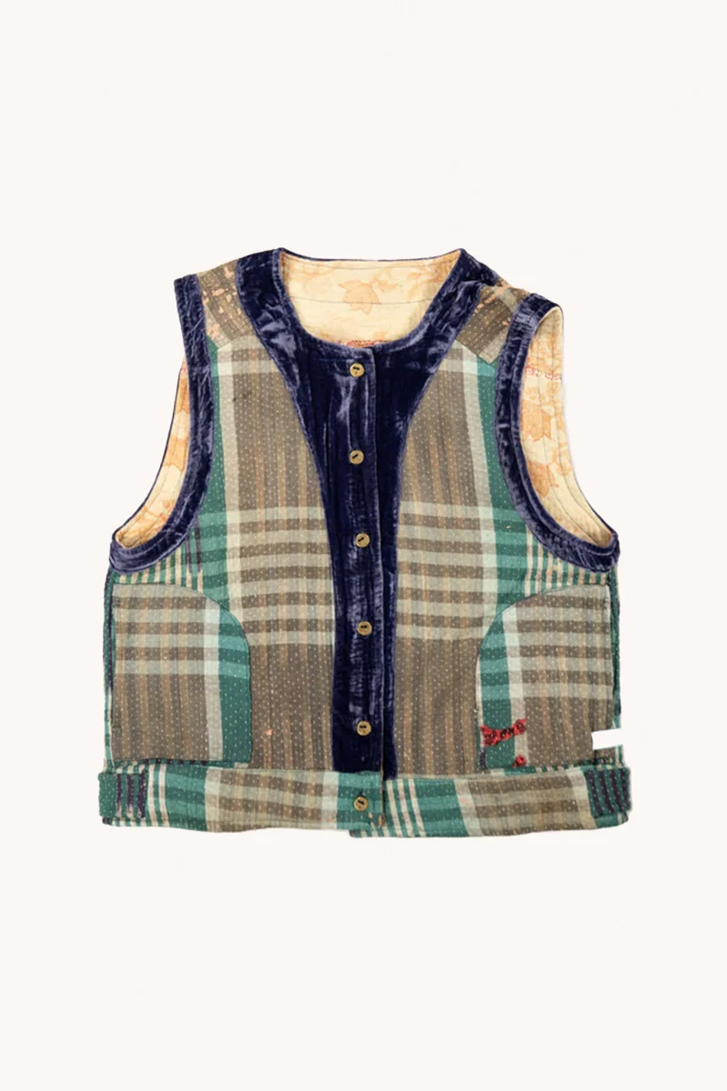 Le gilet Annie est une pièce rare qui célèbre le savoir-faire artisanal et l’élégance intemporelle. Imaginé à Bordeaux puis confectionné avec soin dans un atelier en Inde, il associe la richesse du Kantha, une technique traditionnelle de couture indienne à la délicatesse des broderies Suzani, emblématiques d’Asie centrale.