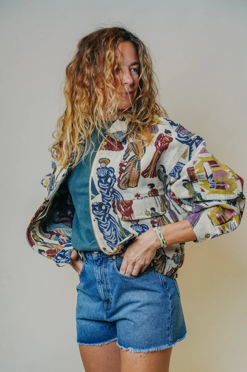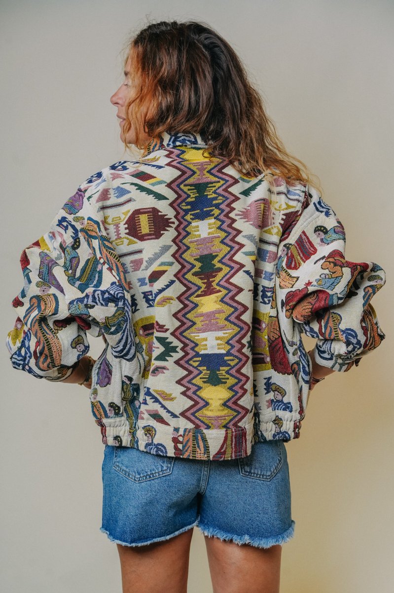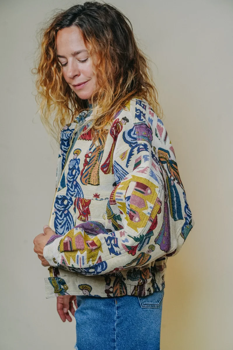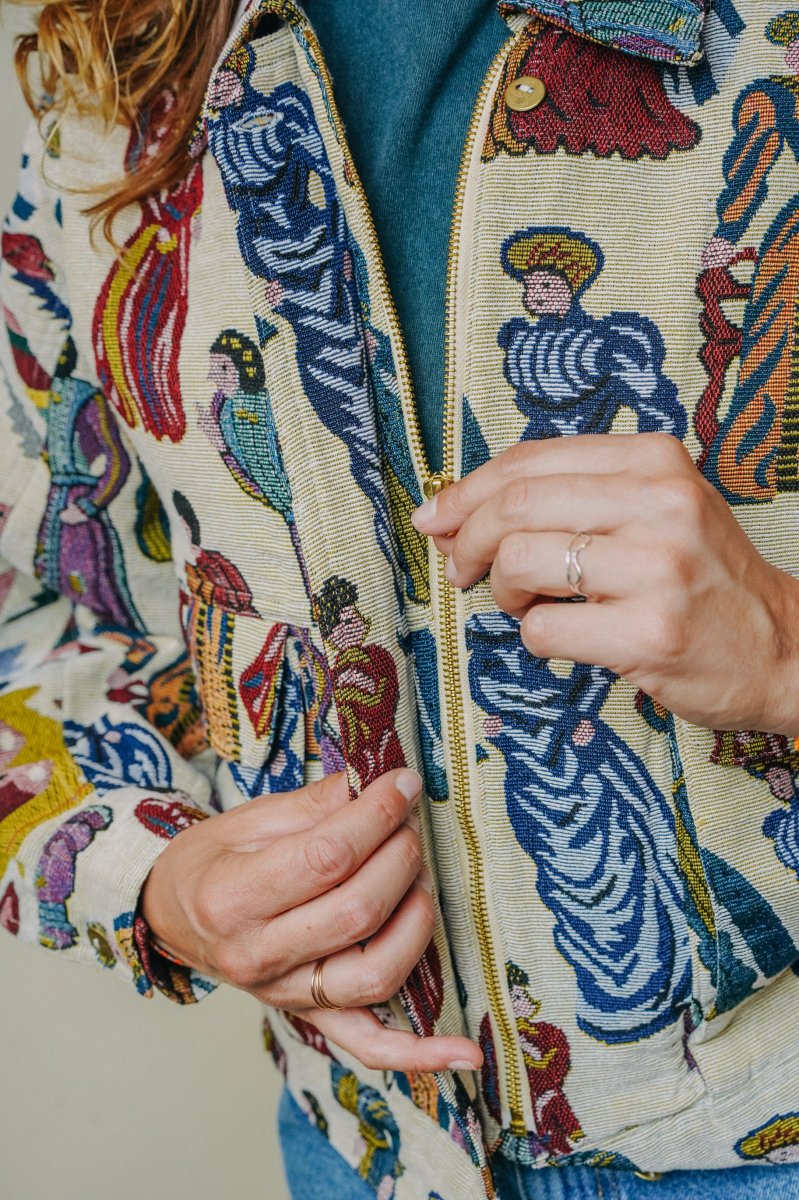 La veste est en 100% coton impression Geisha avec deux poches latérales, une poche cachée sur la manche gauche, une fermeture à zip et une languette avec bouton pour fermer le bas de la veste.