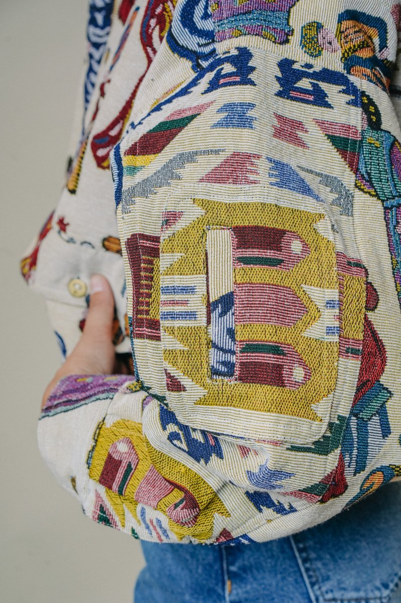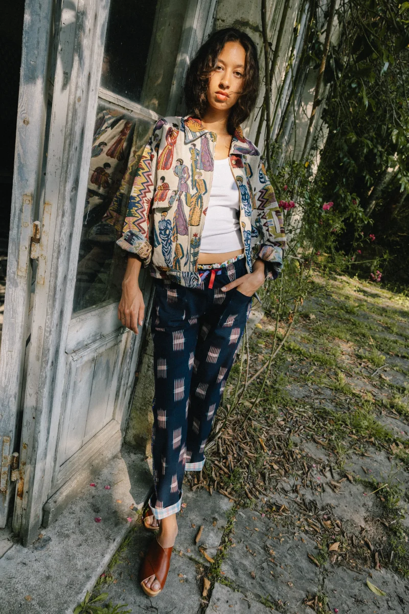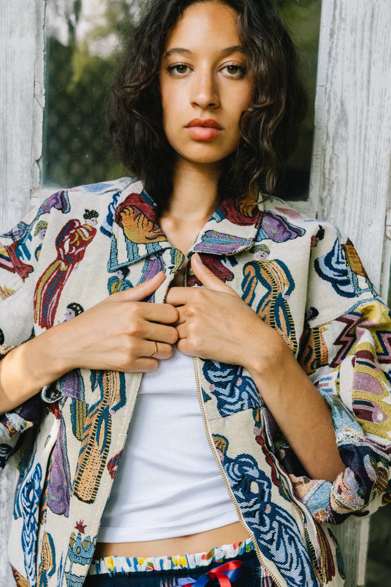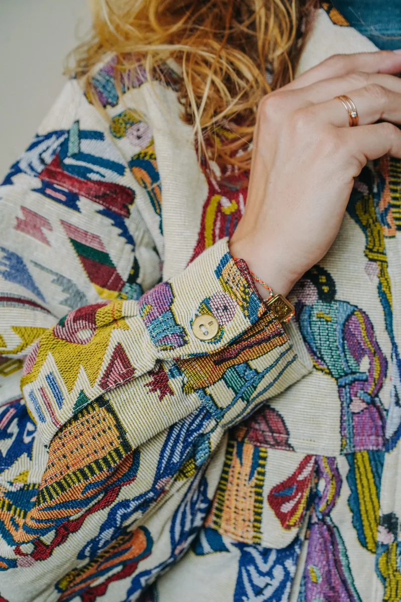 La veste est en 100% coton impression Geisha avec deux poches latérales, une poche cachée sur la manche gauche, une fermeture à zip et une languette avec bouton pour fermer le bas de la veste.