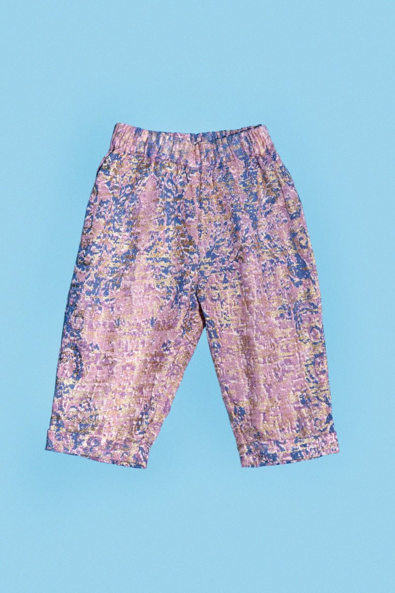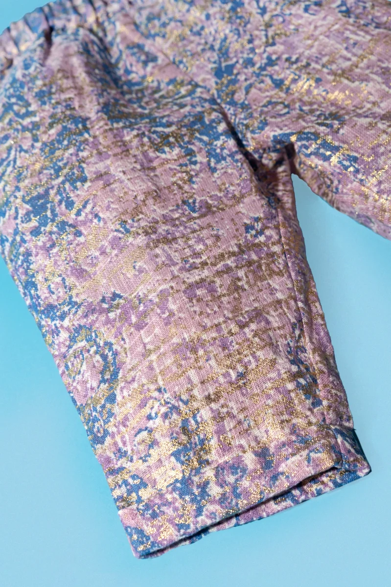 Confectionné dans un tissus aux nuances de bleu, rose et violet avec des touches de doré.