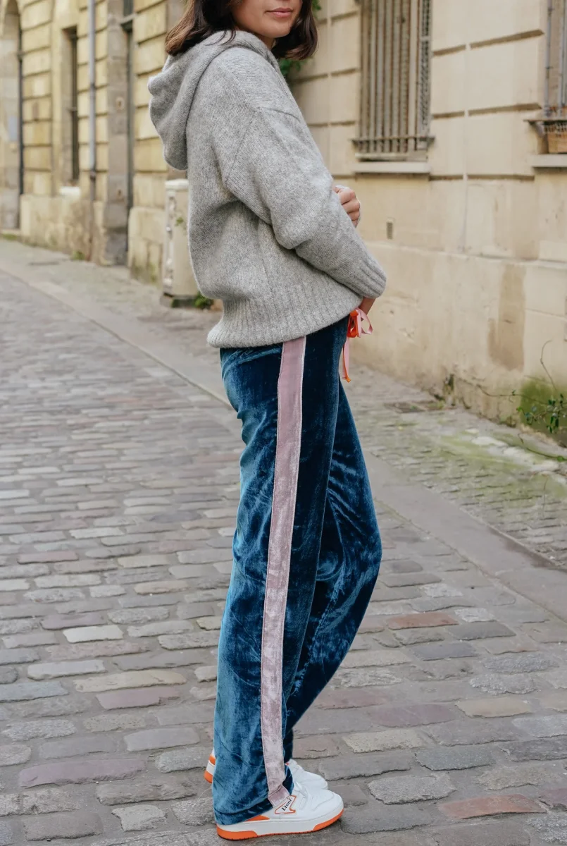 Une bande en velours de soie dépareillé habille le côté de la jambe.