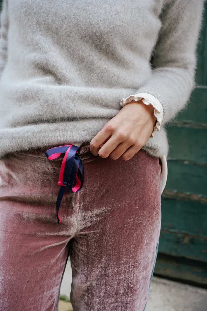 Une bande en velours de soie dépareillé habille le côté de la jambe.