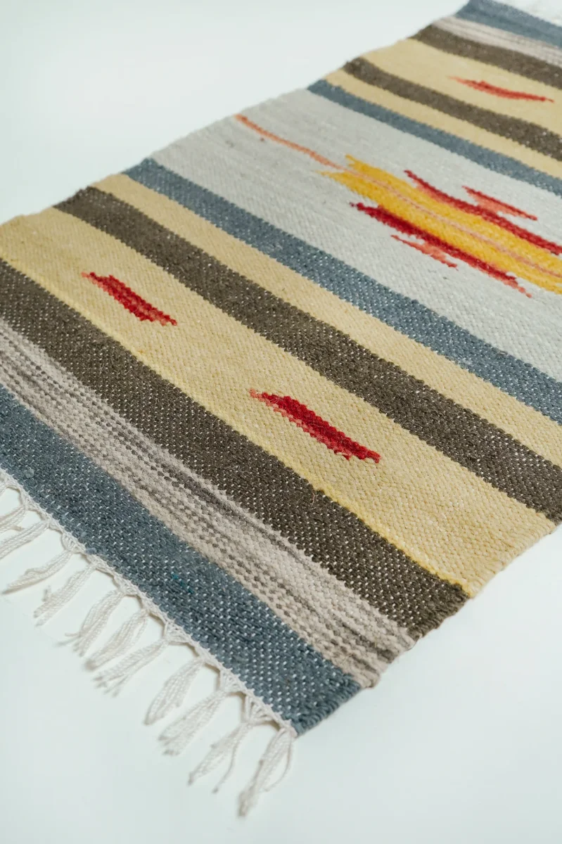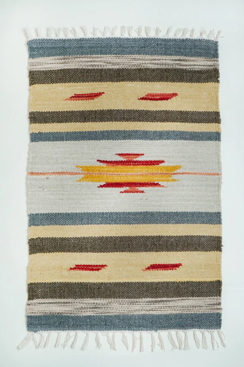 Ce tapis indien Kilim en laine, d’une dimension de 94 x 62 cm, allie élégance et praticité. Avec ses motifs traditionnels tissés à la main, il apporte une touche de chaleur et de style à votre intérieur. Ses couleurs vibrantes et son design intemporel se marient parfaitement à différents types de décoration, qu’elle soit moderne ou classique.