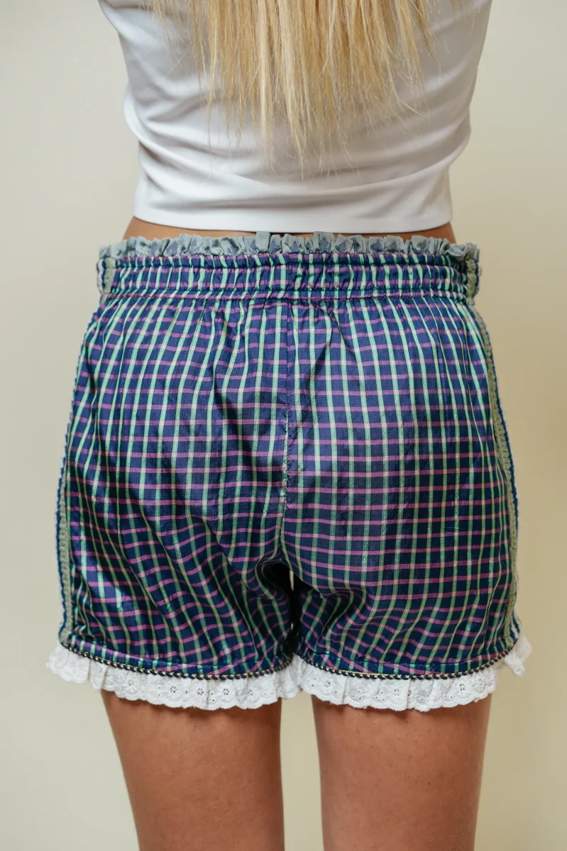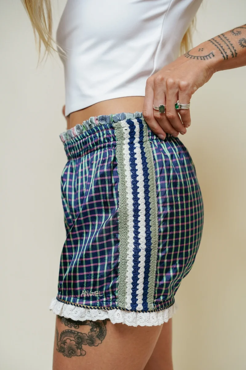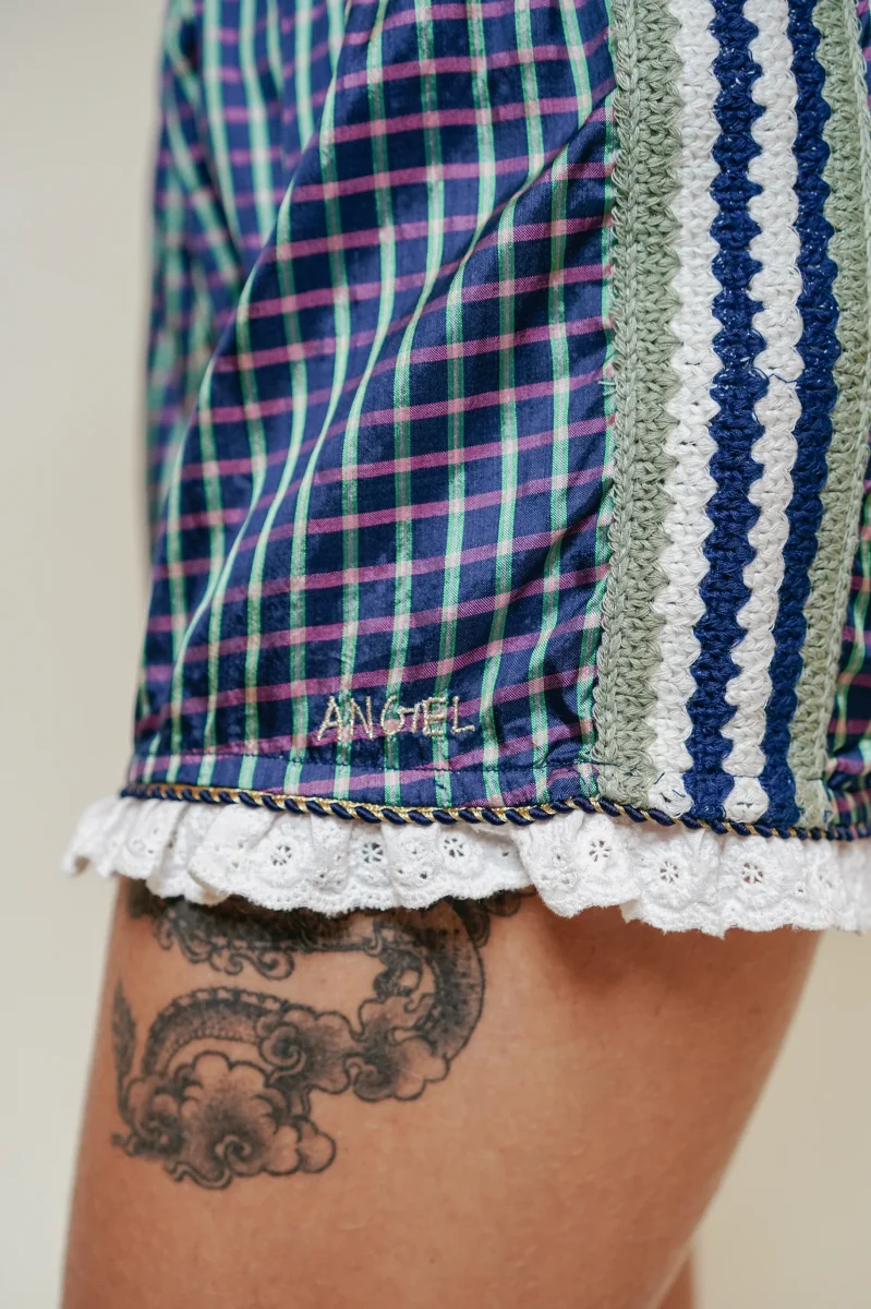 Craquez pour notre adorable short Angel conçus dans une soie délicate. Ici, le short boubou Angel est confectionné dans le la blouse Anoushka. Une fine ceinture à volants dans un tissu tartan, un galon brodé sur le côté des jambes et une délicate dentelle anglaise sur la fin de la jambe.