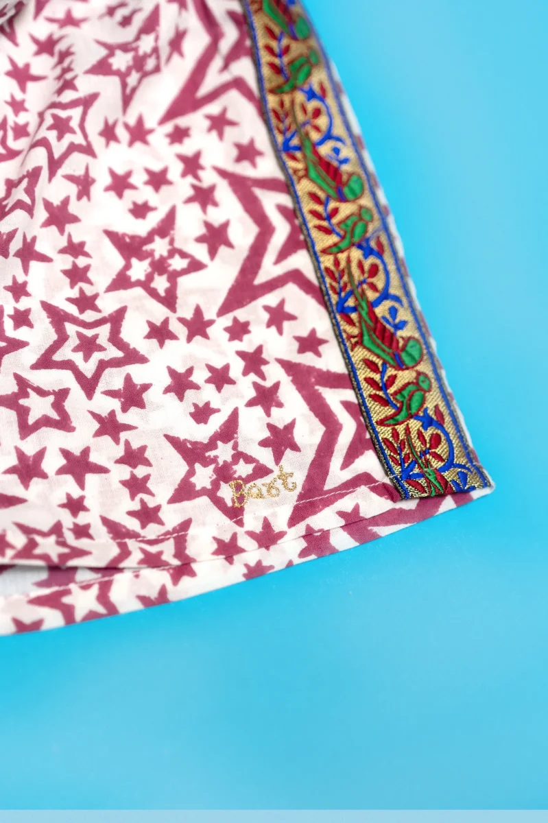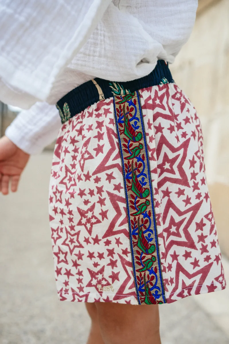 Craquez pour nos adorables shorts boubou. Ici, le short Agatha reprend le tissu du boubou Maxime. Sur les côtés, deux bandes brodées version autrichienne. Une ceinture élastique permet à votre enfant d’enfiler son short facilement. La ceinture ne sert pas le ventre.