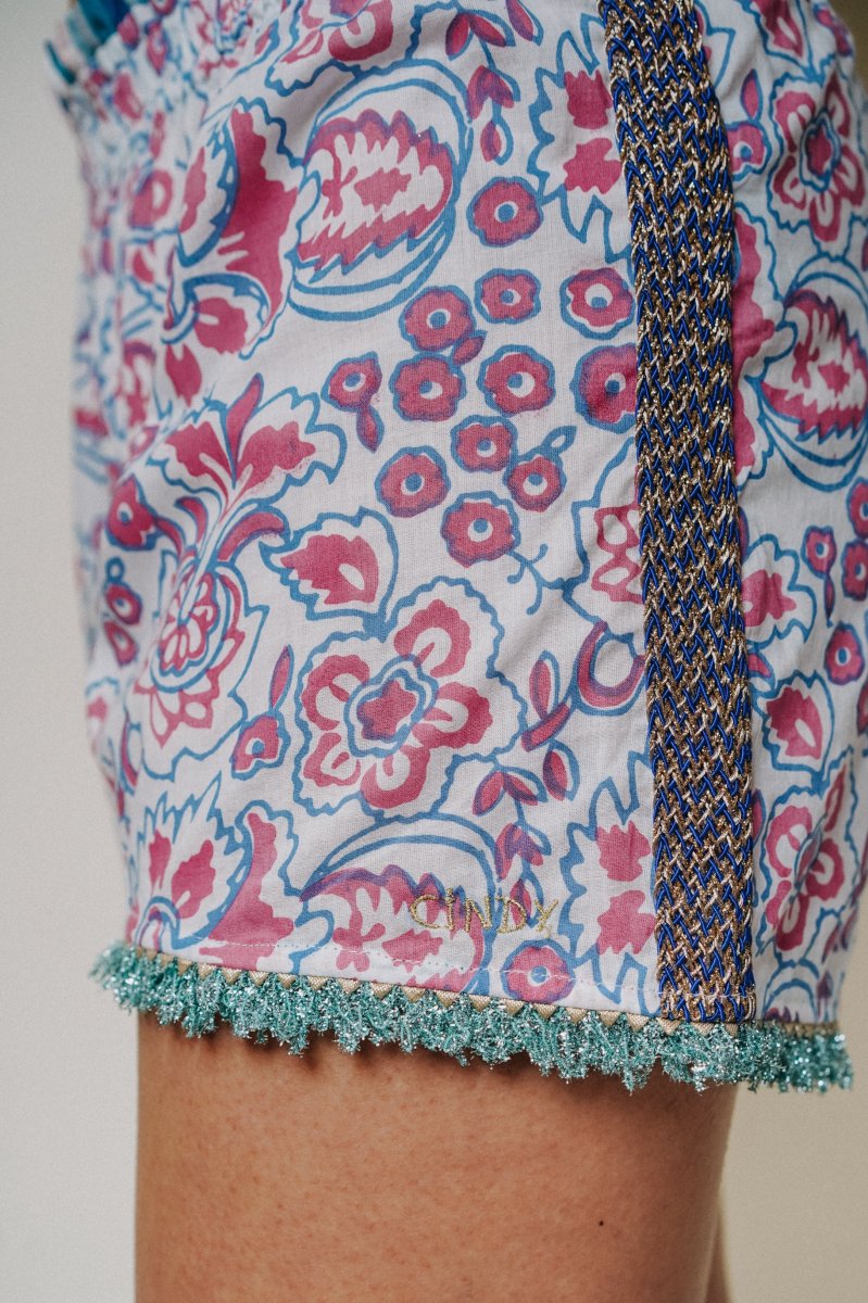 Une fine ceinture à volants dans un tissu liberty bleu, un galon pailleté sur le côté des jambes et des fines franges pailletées sur la fin de la jambe.