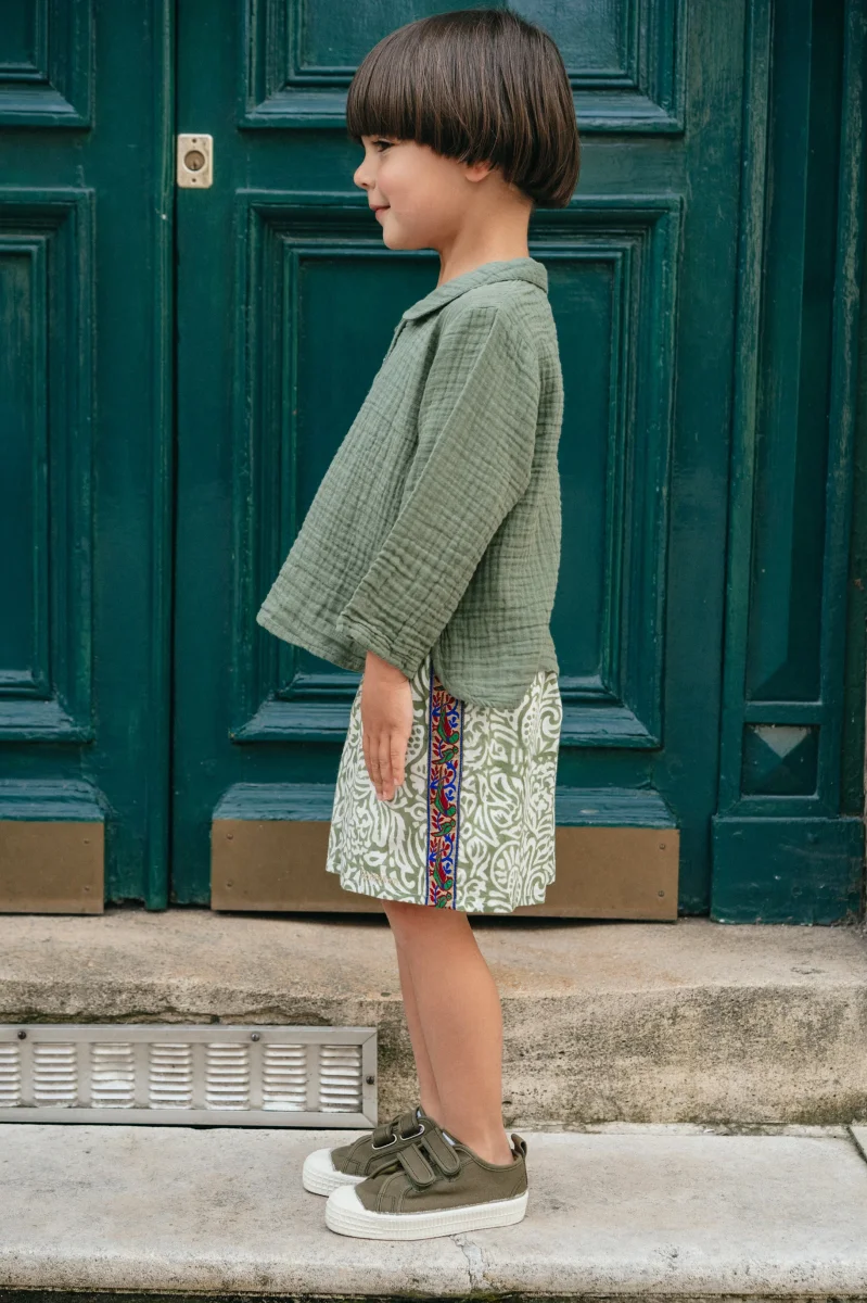 Craquez pour nos adorables shorts boubou. Ici, le short Robinson est la version pour petits garçons du short Thibault à l’homme. Sur les côtés, deux bandes brodées. Une ceinture élastique permet à votre enfant d’enfiler son short facilement. La ceinture ne sert pas le ventre.