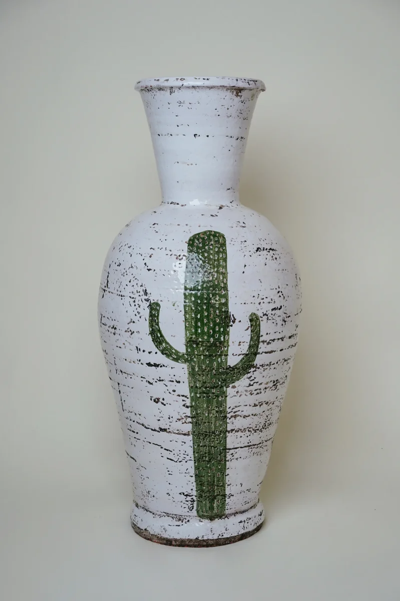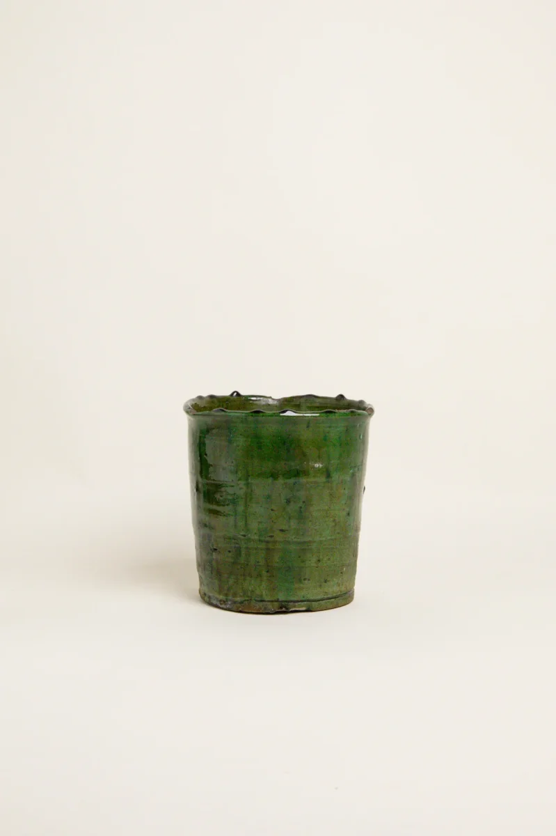 Chaque vase est façonné à la main dans le village de Tamgroute, aux portes du Sahara. Ce lieu emblématique est célèbre pour sa poterie à la teinte verte caractéristique, obtenue grâce à un savoir-faire séculaire. L’émail, composé de manganèse, de cuivre et d’argile locale, est cuit dans des fours traditionnels en terre, ce qui donne à chaque pièce ses nuances et ses irrégularités si charmantes.