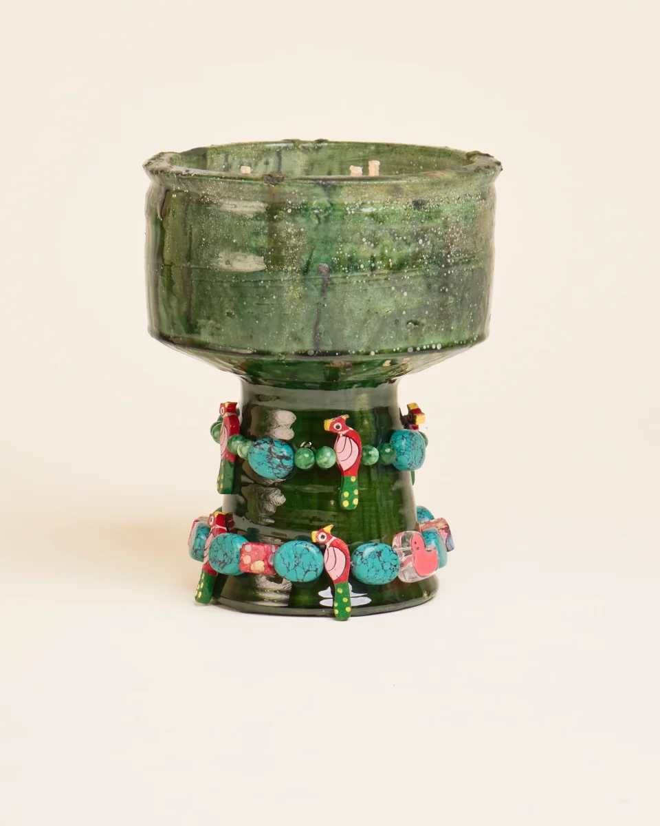 À cette base brute et authentique, Manon apporte sa touche personnelle : de délicats bijoux de perles faits main, qu’elle compose avec amour dans son atelier. Ces ornements viennent enlacer le vase, créant une pièce poétique qui marie la terre et la lumière, la tradition marocaine et la création contemporaine.