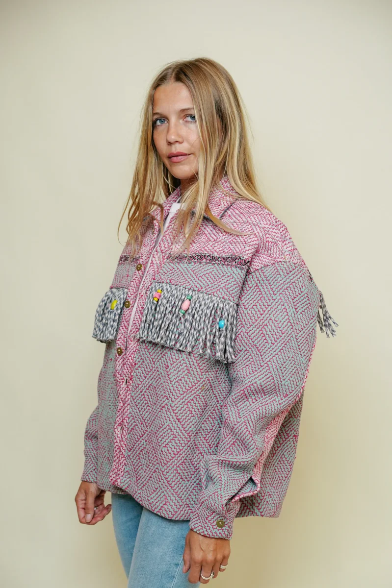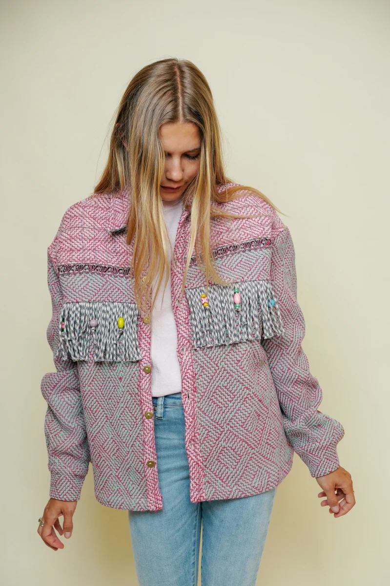 La grande nouveauté de cette saison ? Les franges en kantha habillées de perles, cousues en frise tout le long du dos et à l’avant au niveau de la poitrine. Un détail original et raffiné qui attire la lumière et donne du relief à la pièce. Le gilet est entièrement réversible : l’envers, plus sobre, sans franges, permet un porté plus épuré selon vos envies.