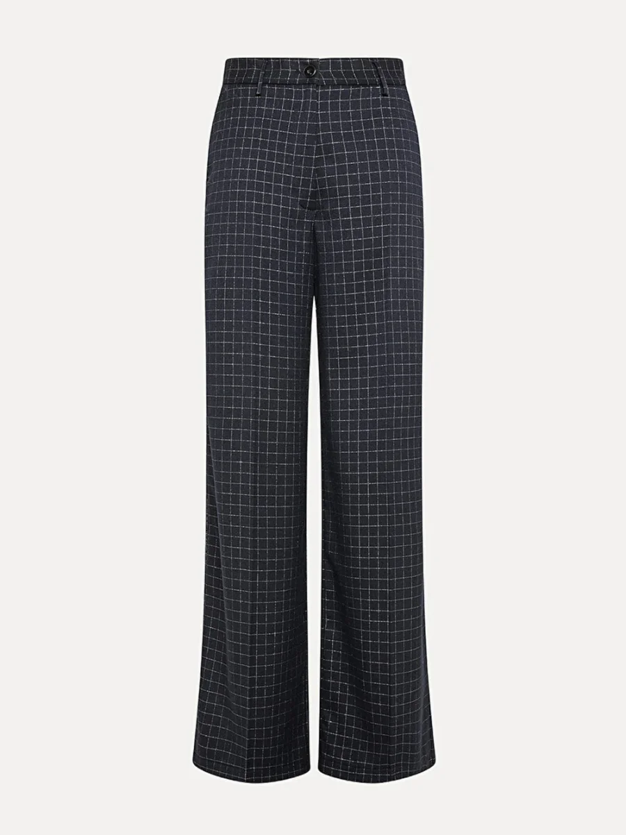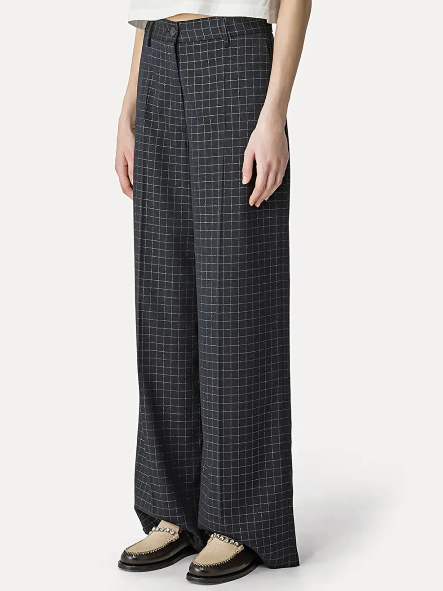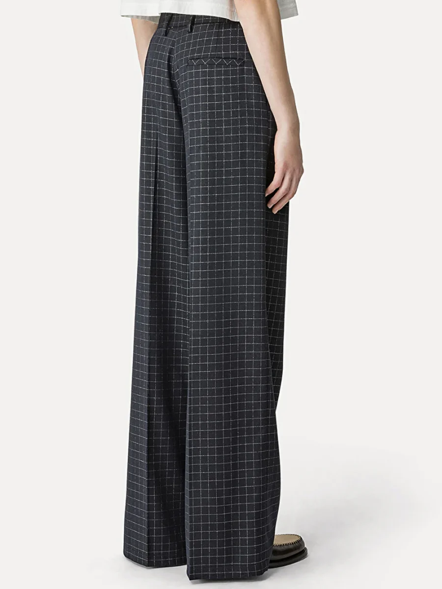 Pantalon Batavia Silver signé Forte_Forte confectionné dans un tissu noir décoré d’un quadrillage scintillant en lurex argenté. Une coupe palazzo large à taille haute.