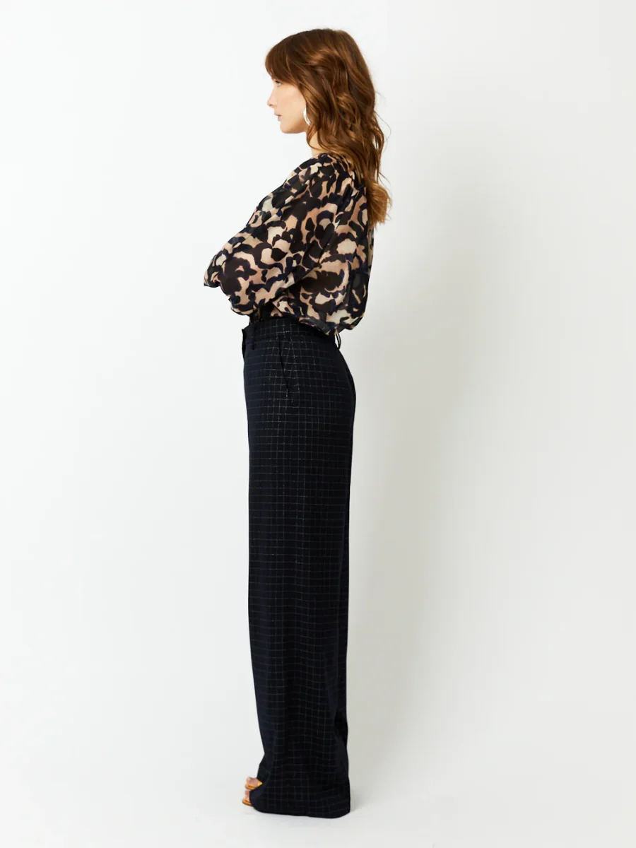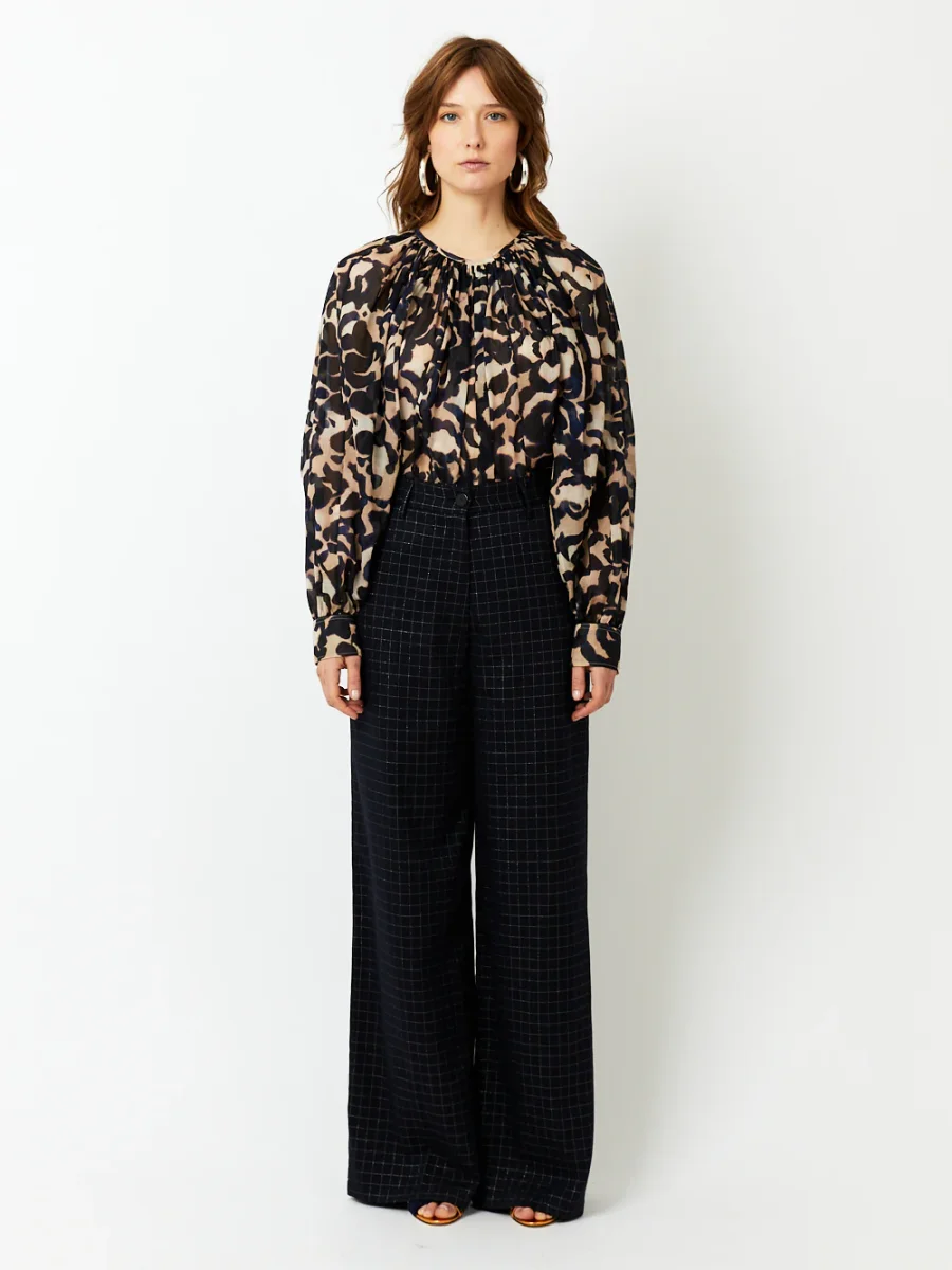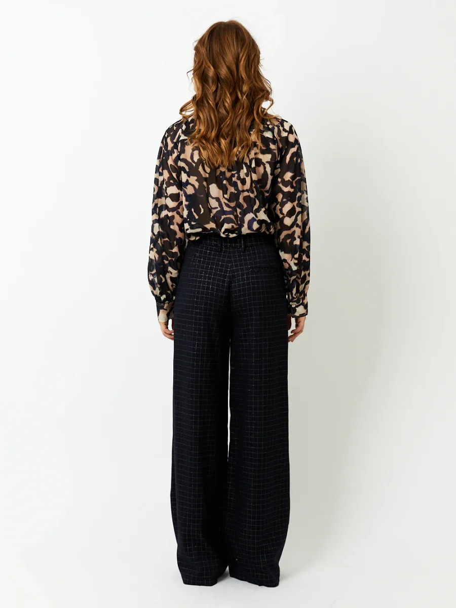 Pantalon Batavia Silver signé Forte_Forte confectionné dans un tissu noir décoré d’un quadrillage scintillant en lurex argenté. Une coupe palazzo large à taille haute.