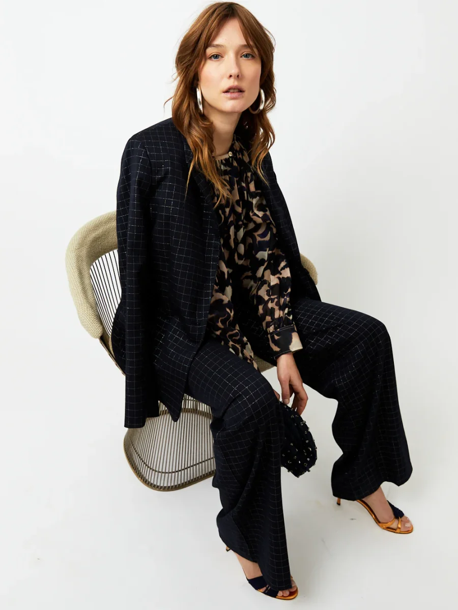 Pantalon Batavia Silver signé Forte_Forte confectionné dans un tissu noir décoré d’un quadrillage scintillant en lurex argenté. Une coupe palazzo large à taille haute. – Poches italiennes sur les côtés et poches passepoilées à l’arrière – Fermeture éclair dissimulée sur le devant avec bouton – Fabriqué en Italie – Le mannequin mesure 1m75 et porte […]