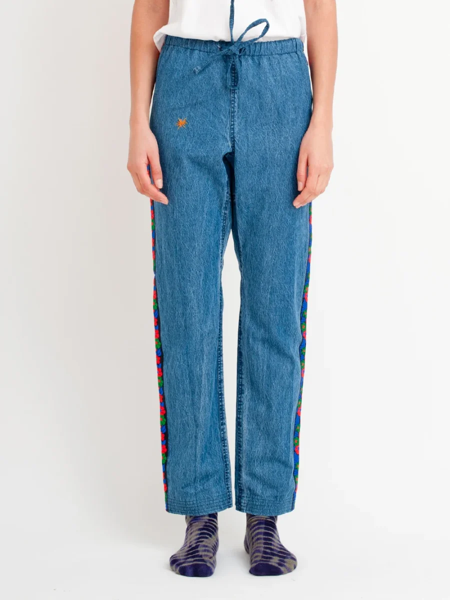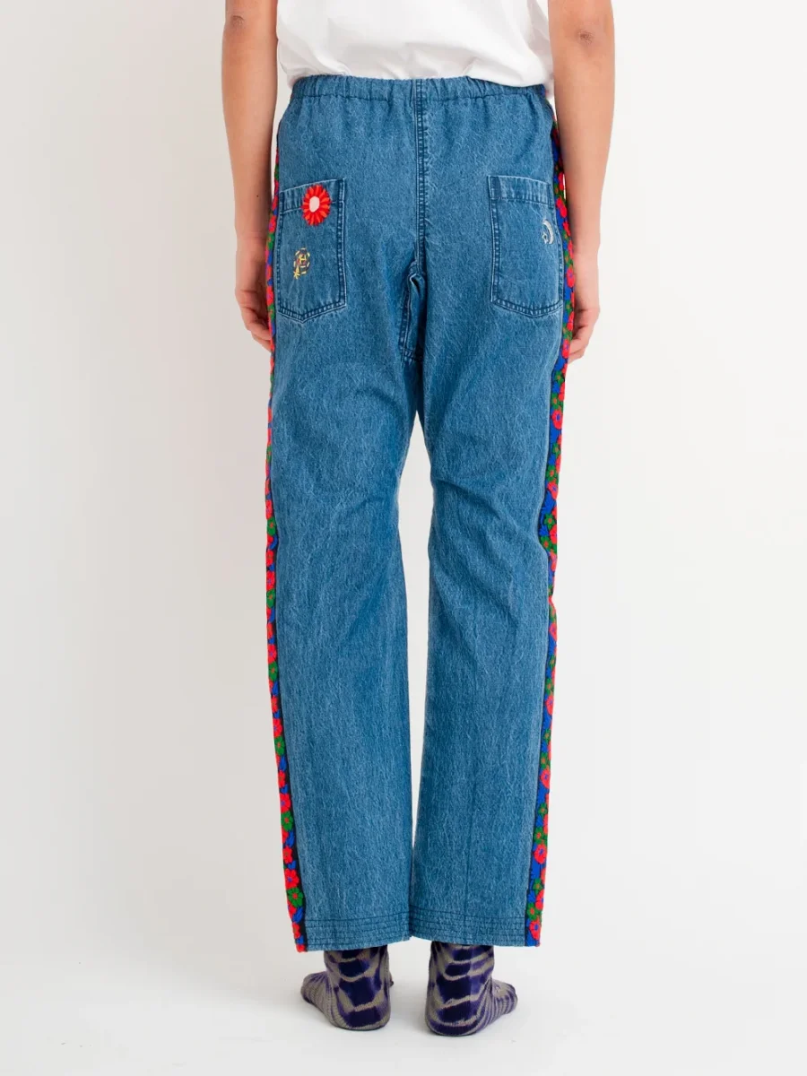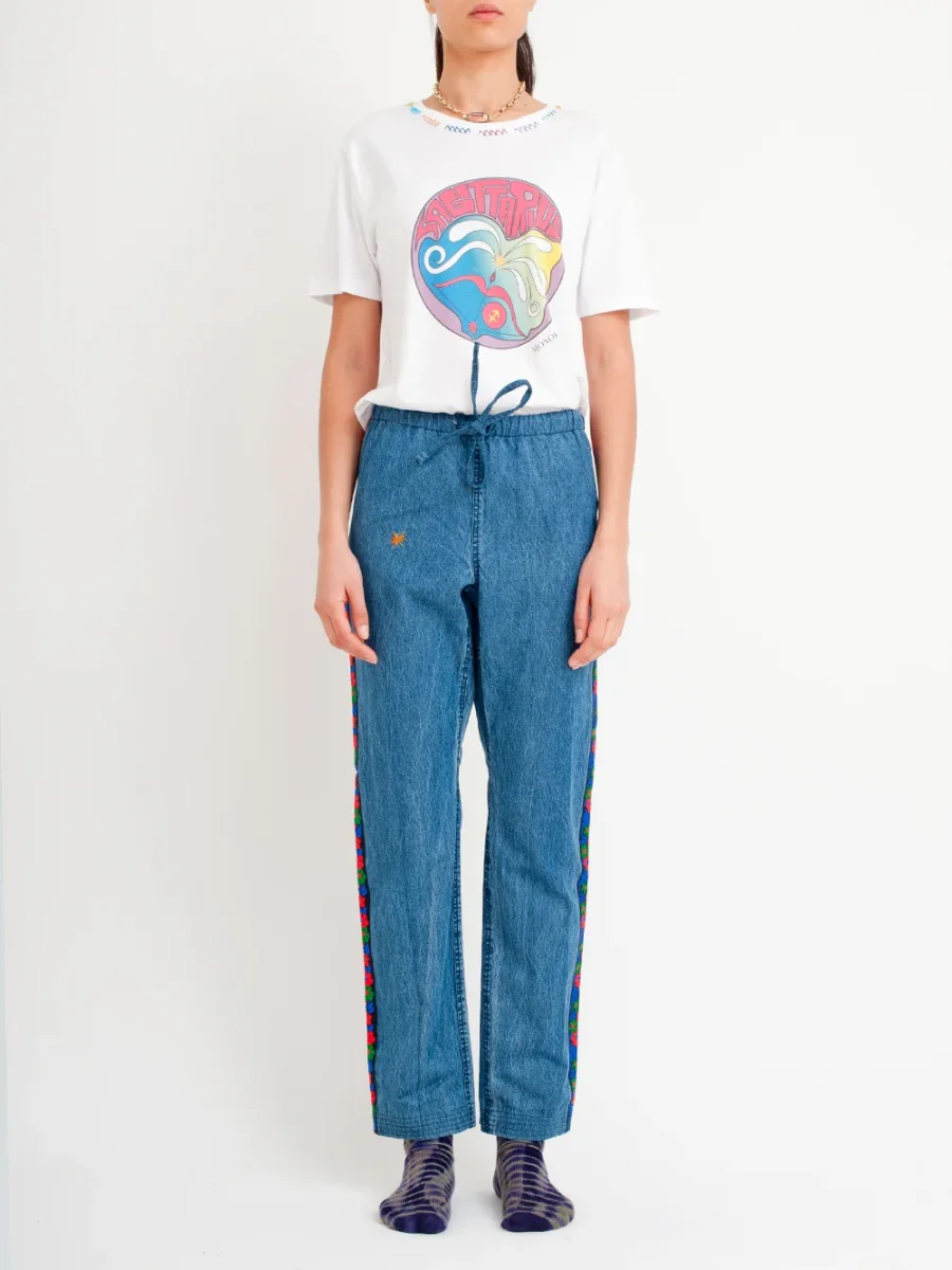 Pantalon denim Monoki. Ce pantalon ample en denim bleu a des bandes imprimées en soie sur les côtés et est brodé de fines broderies et de patchs. Le modèle a trois poches, une taille élastique et un cordon à nouer. Taille unique.