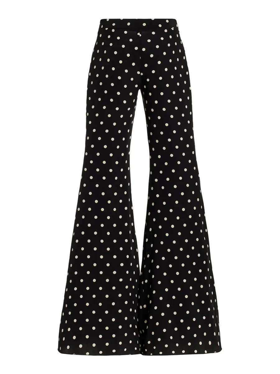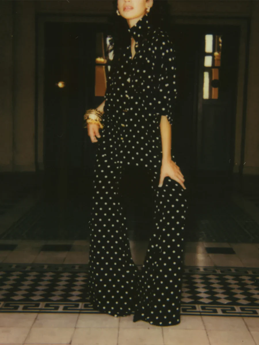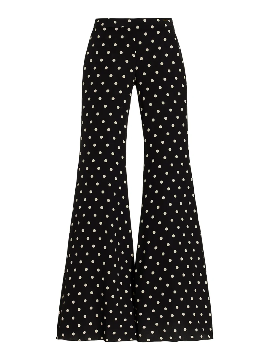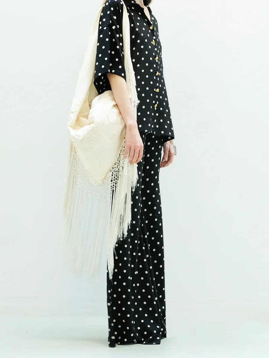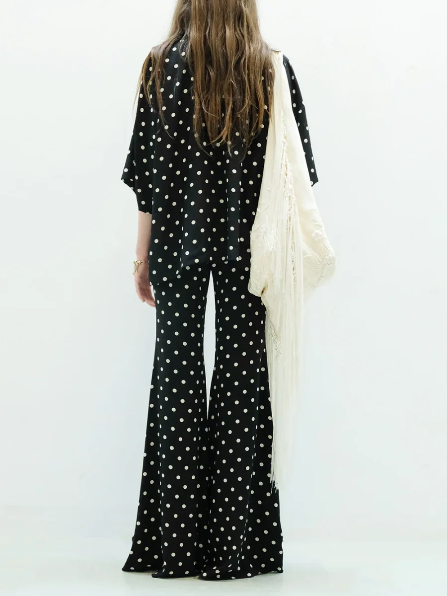 Pantalon Zaoua signé Françoise confectionné en en crêpe de soie imprimée de pois noir et blanc. Une pièce réalisée avec des tissus non utilisés issus des grandes maison de mode.