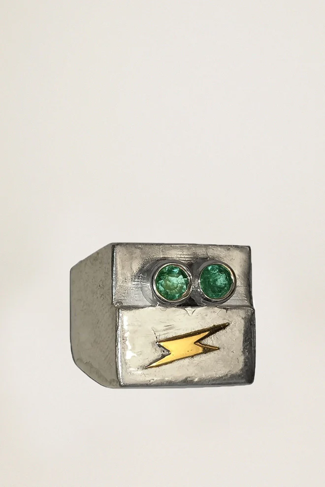 Découvrez la chevalière revisitée par Pierre Rioufol avec deux émeraudes et un éclair en or pour la touche rock. Bague robot en argent 925, éclair en Or 18 carats, émeraudes
