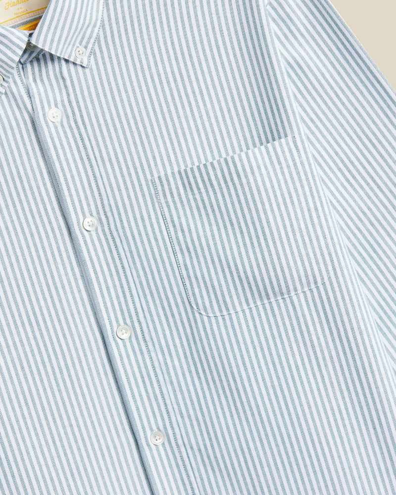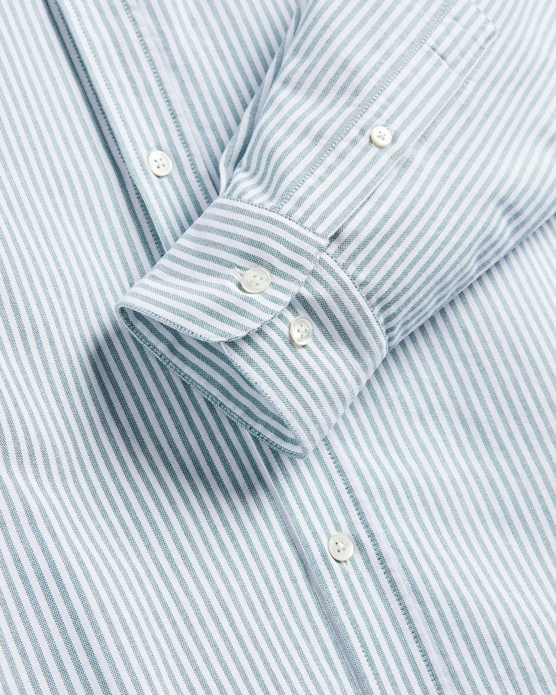 Son motif à fines rayures vertes et blanches apporte une touche de fraîcheur et de modernité, tandis que son col boutonné assure une tenue impeccable en toute occasion. Les boutons en nacre soulignent la qualité artisanale et l’attention portée aux détails.