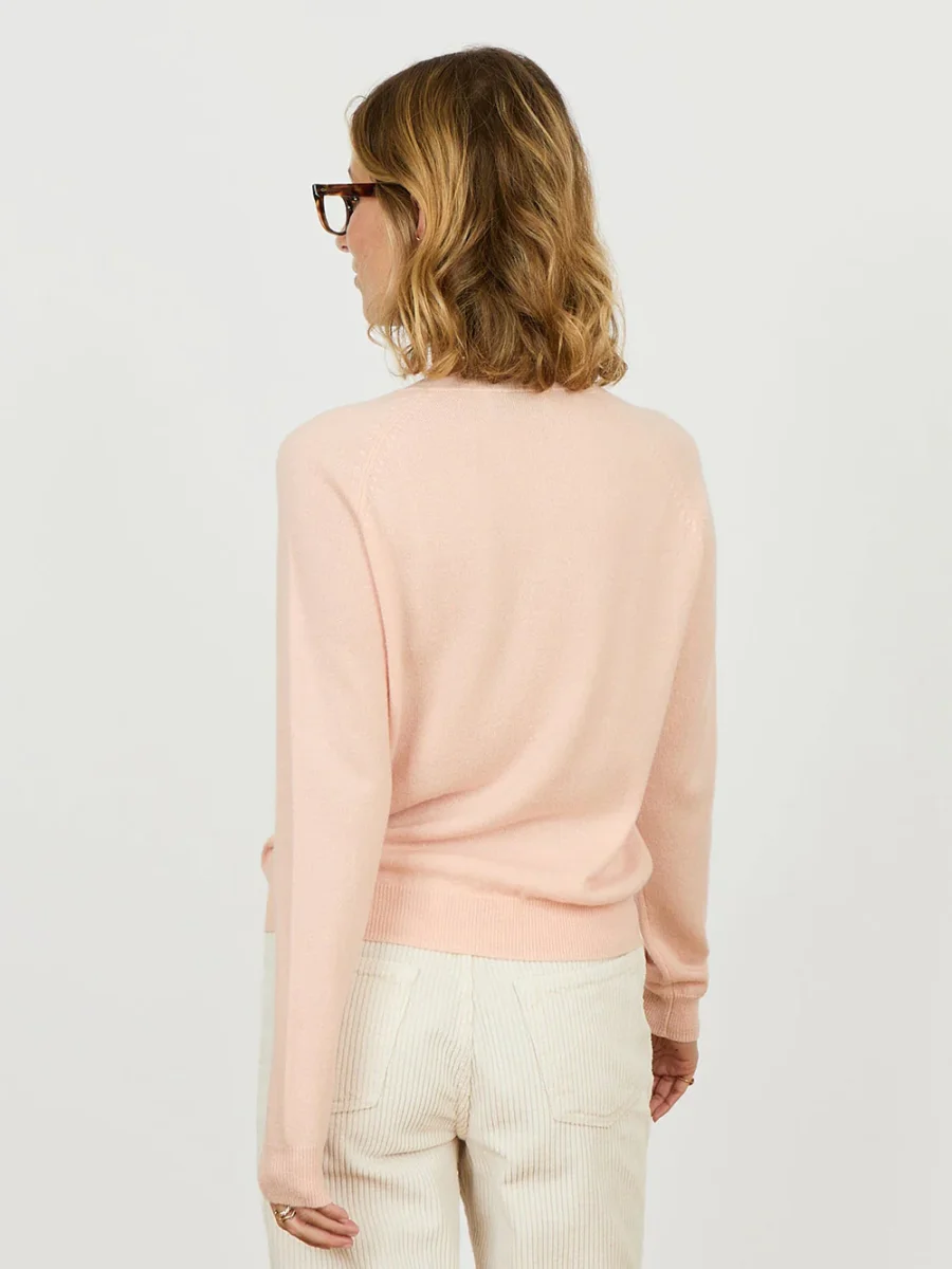 Pull Mila Light Blush 20 signé Alexandra Golovanoff confectionné en cachemire de couleur rose poudré. Un pull à la maille légère, aux manches longues raglan et col rond côtelé.