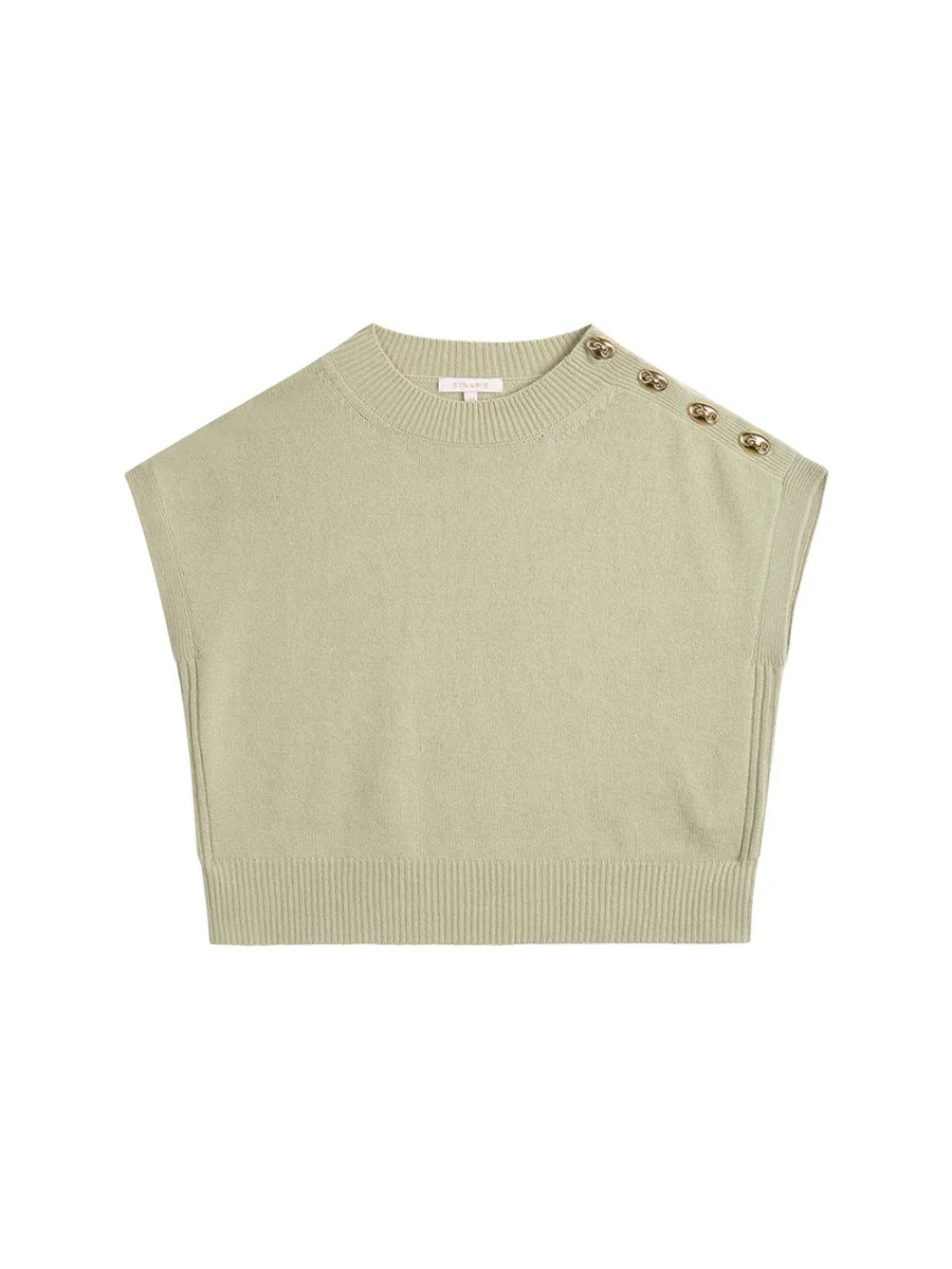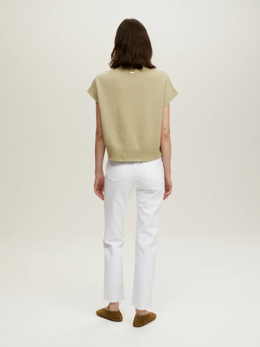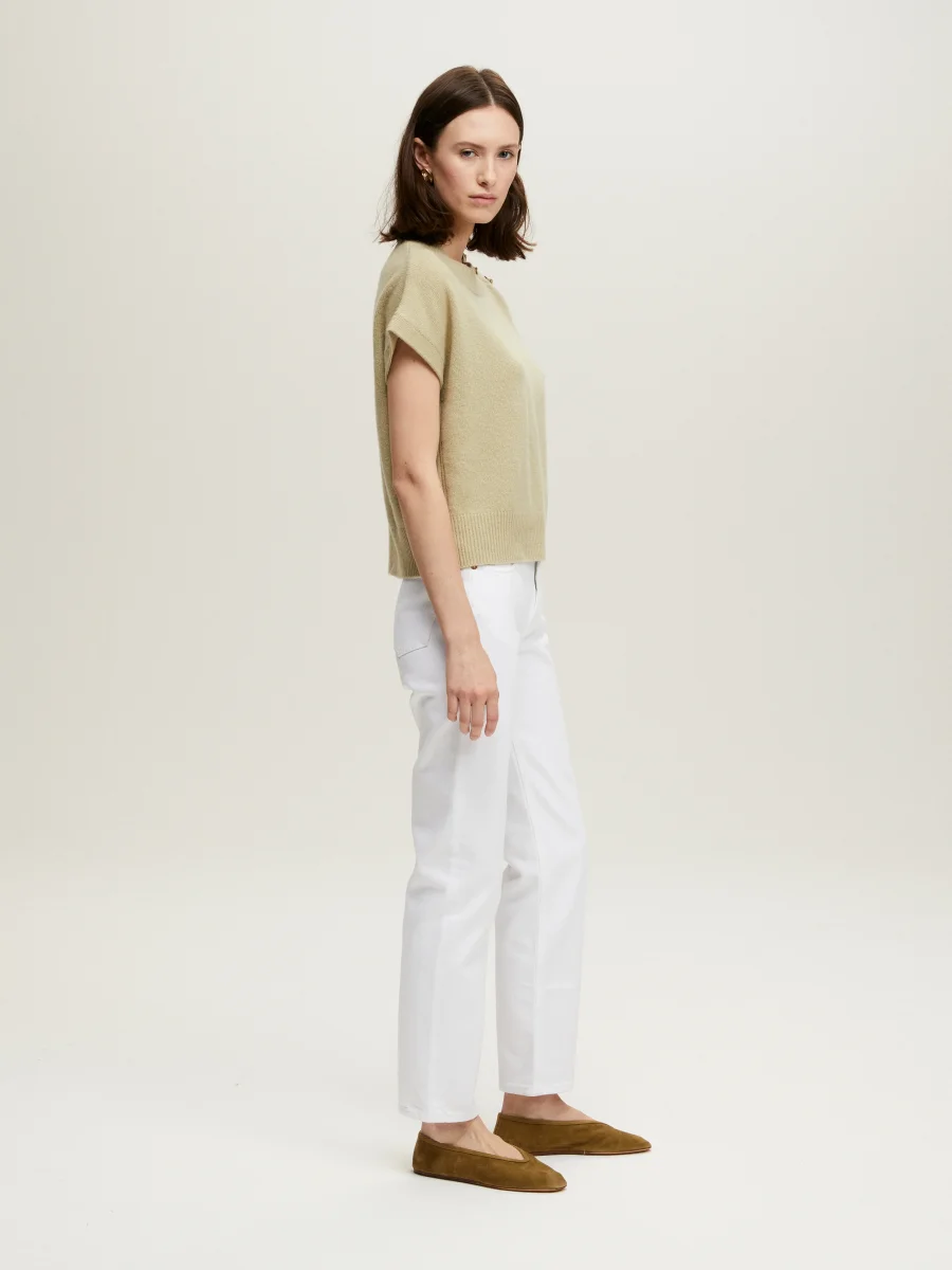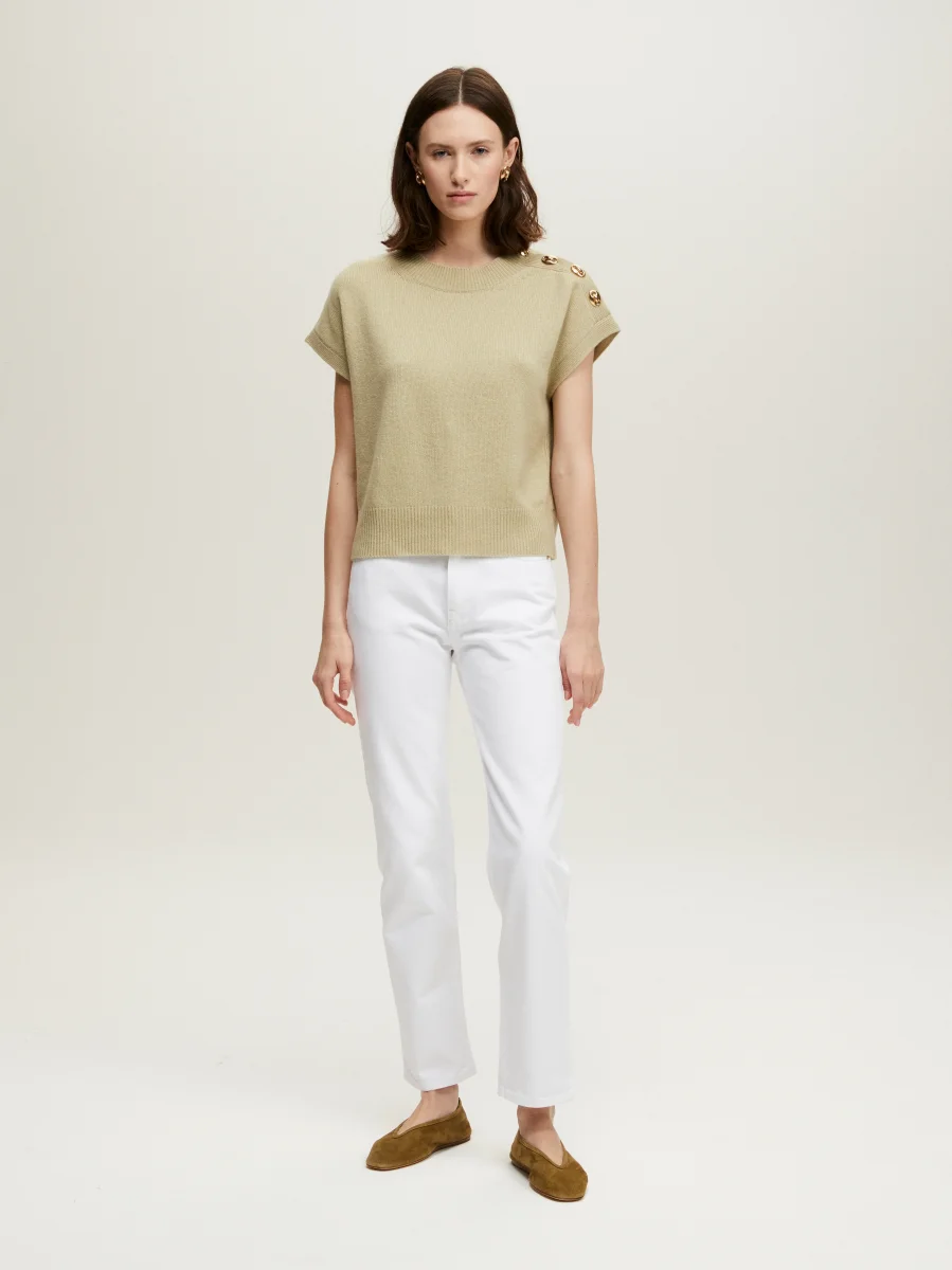 Pull Mini Gregor signé BY Marie Collection confectionné dans un mélange de laine et cachemire de couleur vert amande et décoré de boutons dorés à l’or fin issus de la collection Cophea dessinés et élaborés par les ateliers Gas Bijoux à Marseille. Les cachemires BY MARIE sont réalisés en série limitée à la main et à l’aide d’une machine à tricot ancienne dans une organisation au Népal qui existe depuis 20 ans. Cette entreprise est composée essentiellement de femmes et comme nous, a à coeur la transmission d’un savoir faire de qualité.