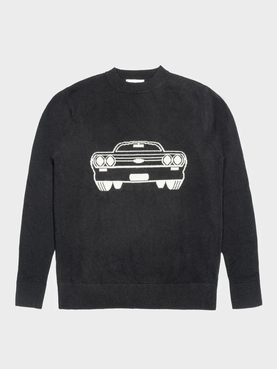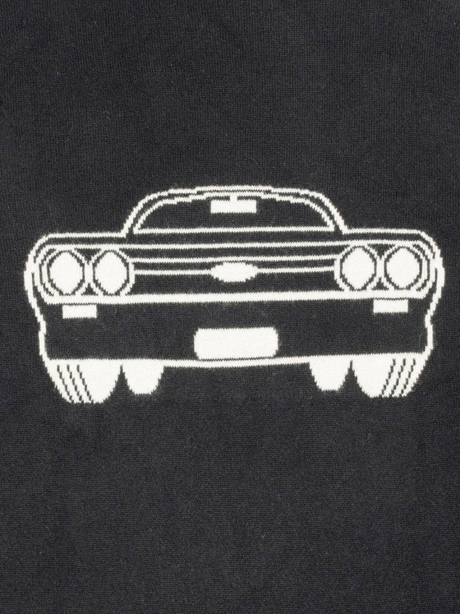 Pull N°71 Voiture signé Leret Leret confectionné en cachemire noir décoré d’une voiture aux contours blanc contrastants. Un pull col rond et aux manches longues.