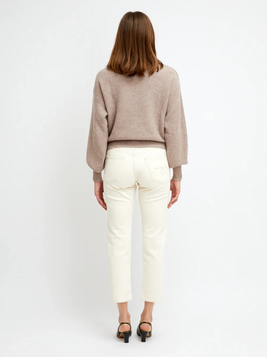 Pull Niki Toast signé By Marie Collection confectionné dans une maille anglaise en cachemire de couleur beige foncé. Les cachemires BY MARIE sont réalisés en série limitée à la main et à l’aide d’une machine à tricot ancienne dans une organisation au Népal qui existe depuis 20 ans. Cette entreprise est composée essentiellement de femmes et comme nous, a à coeur la transmission d’un savoir faire de qualité.