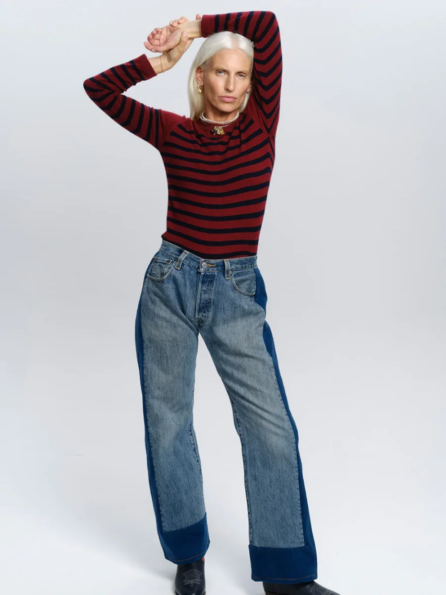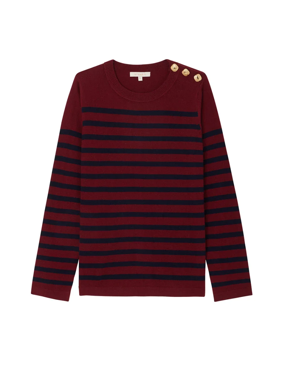 Pull Théo Rayé signé By Marie Collection confectionné en cachemire bordeaux aux rayures bleu marine. Une marinière classique en maille légère à la coupe légèrement ajustée. Les cachemires BY MARIE sont réalisés en série limitée à la main et à l’aide d’une machine à tricot ancienne dans une organisation au Népal qui existe depuis 20 ans. Cette entreprise est composée essentiellement de femmes et comme nous, a à coeur la transmission d’un savoir faire de qualité.