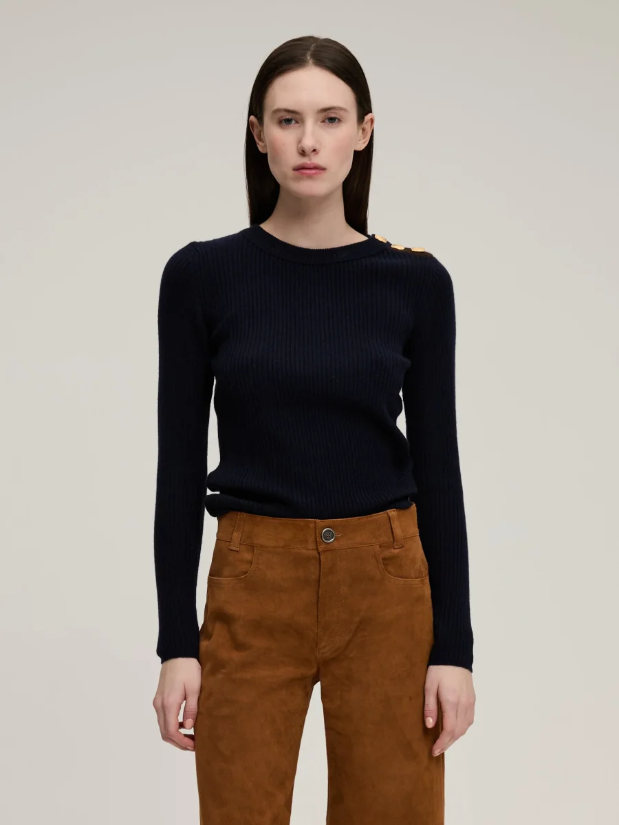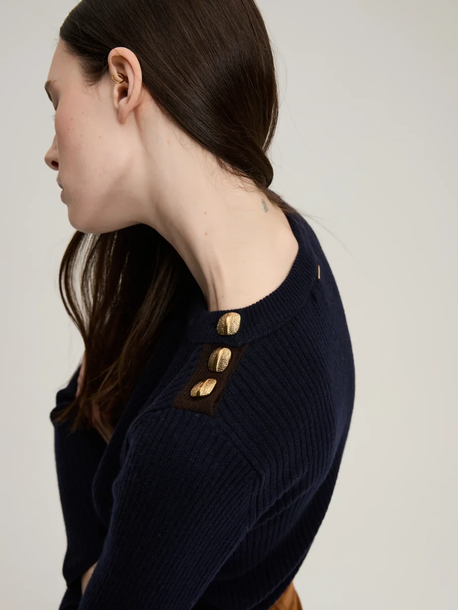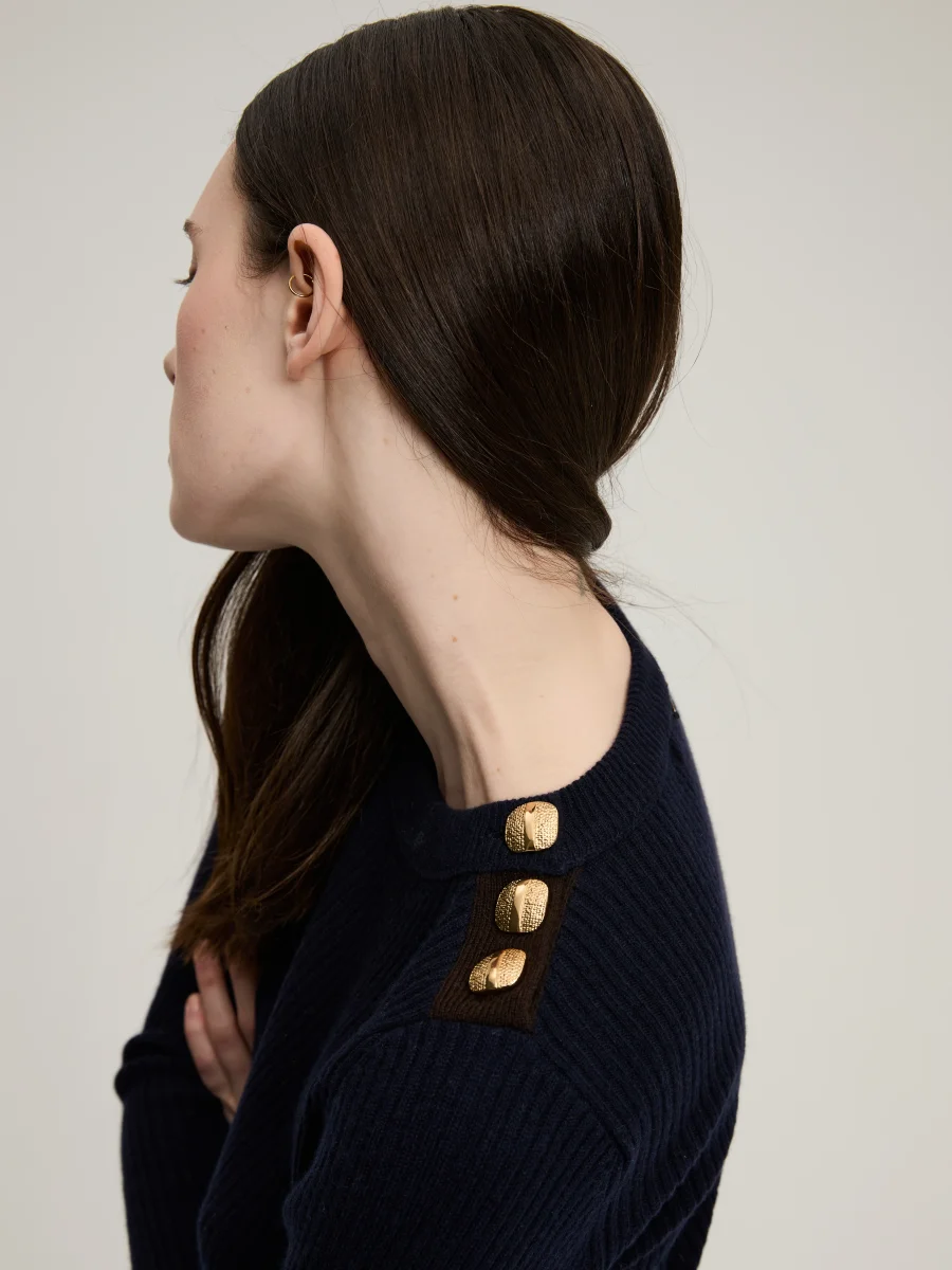 Pull Théodore signé BY Marie Collection confectionné en cachemire de couleur bleu marine. Un pull près du corps dans une maille côtelée à la patte de boutonnage contrastante marron. Boutons texturés dorés à l’or fin.