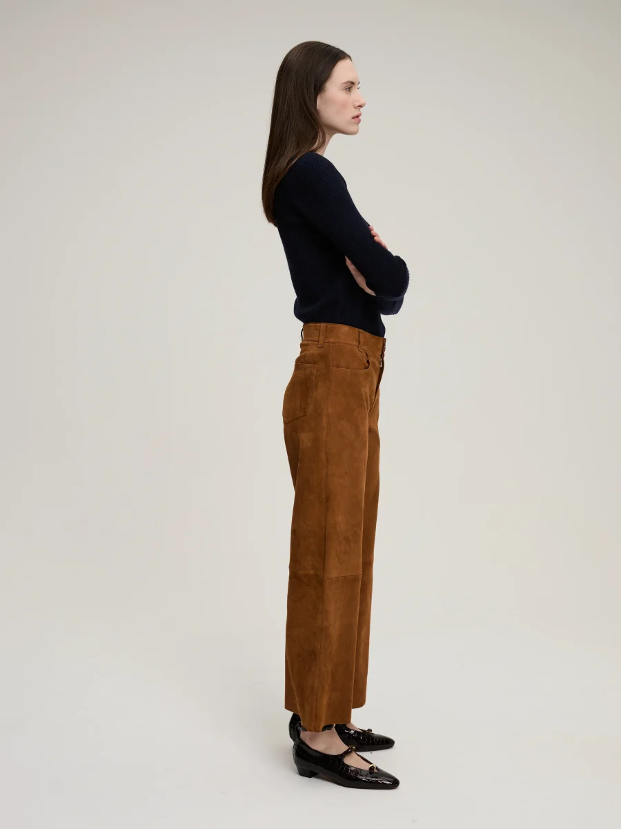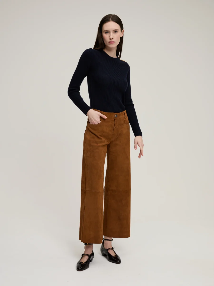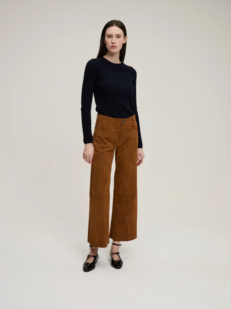 Pull Théodore signé BY Marie Collection confectionné en cachemire de couleur bleu marine. Un pull près du corps dans une maille côtelée à la patte de boutonnage contrastante marron. Boutons texturés dorés à l’or fin.