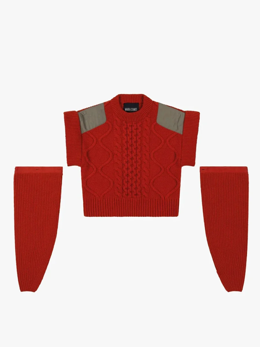Pull Torsadé Crew Amber signé Marfa Stance dans un mélange de laine et de cachemire rouge. Un pull aux manches longues amovibles accompagnées de détails patchwork anthracite au niveau des épaules et de la nuque.