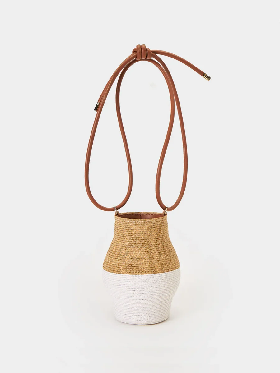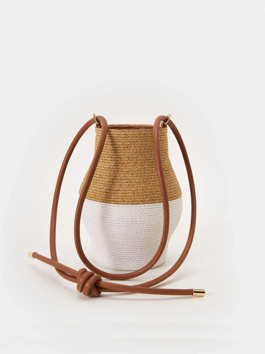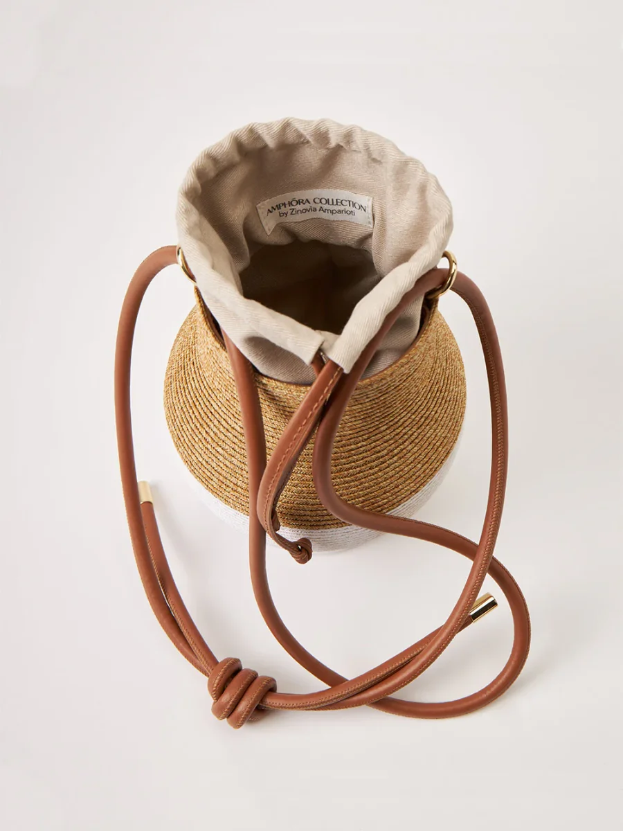 Sac Amphora Bicolor signé Amphora Collection confectionné en paille à la base blanche. Une pièce issue de la collection « Sculptures » dont le design s’inspire des amphores grecques.