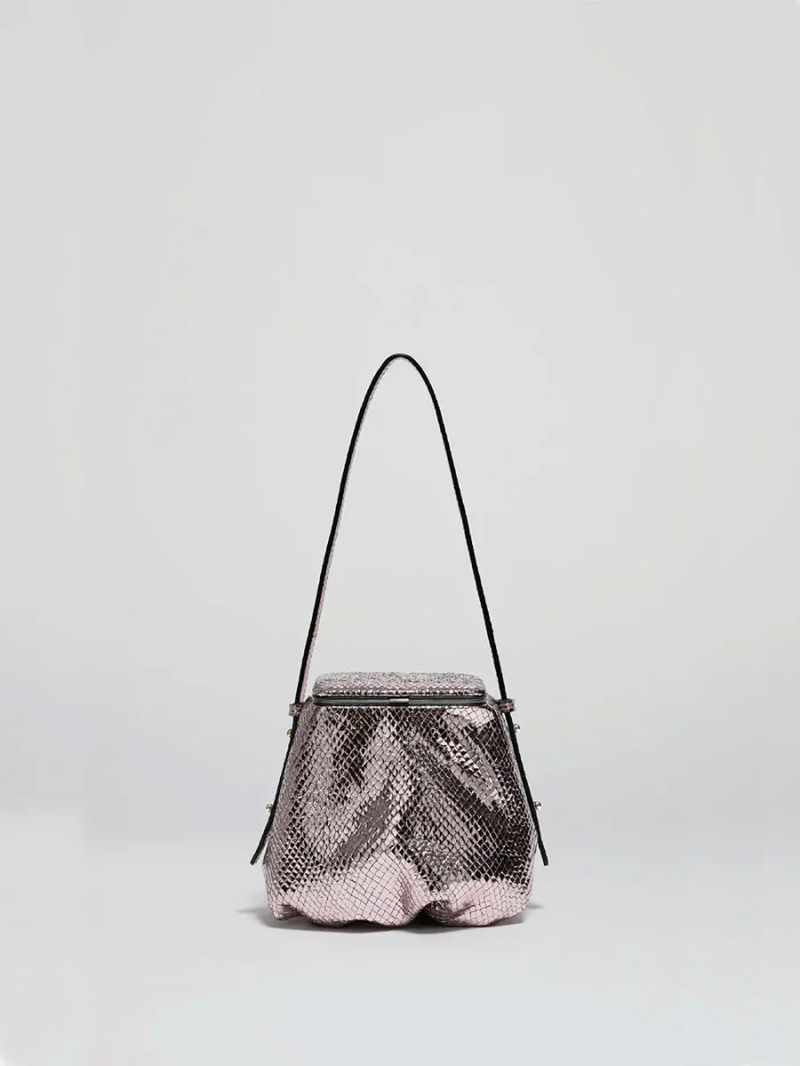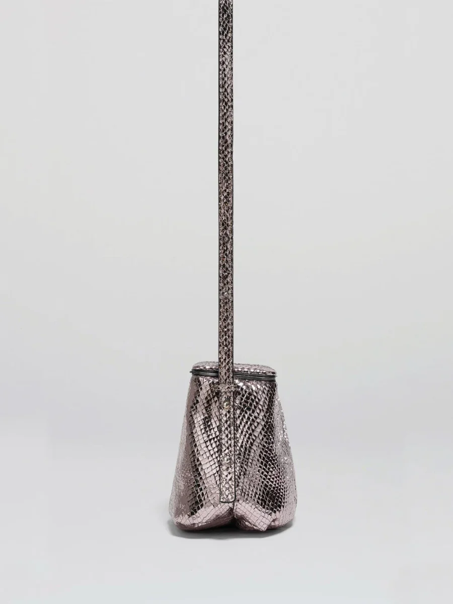 Sac Blaine Disco Ball Lutz Morris. Ce sac est réalisé en cuir tanné en Allemagne. Il peut se porter à l’épaule grâce à la sangle réglable ou comme pochette. Cette pièce se compose du cadre signature de la marque en acier avec une languette qui s’ouvre sur une pochette plissée volumineuse doublée en suédine. Le logo de la marque est gravé en relief au dos du sac.