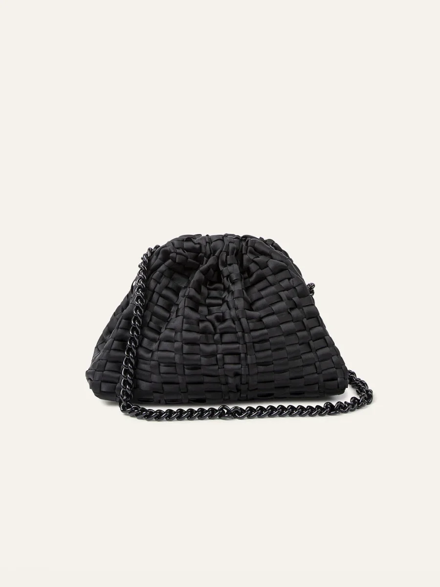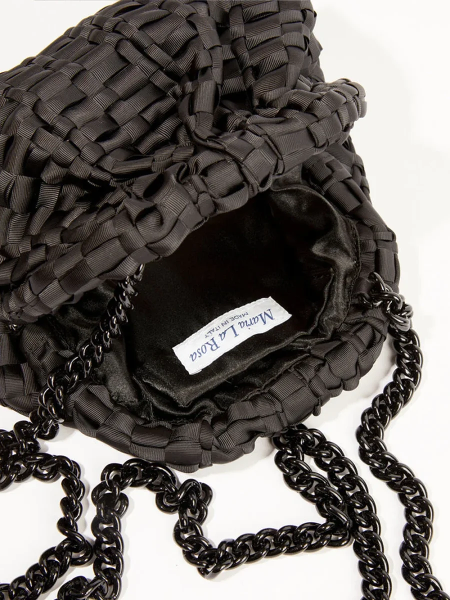Le sac Game Mini de la créatrice Maria La Rosa est fabriqué à la main en Italie. – Couleur noire – Fermoir aimanté – Doublé en satin – Chaîne permet de porter à l’épaule ou croisé