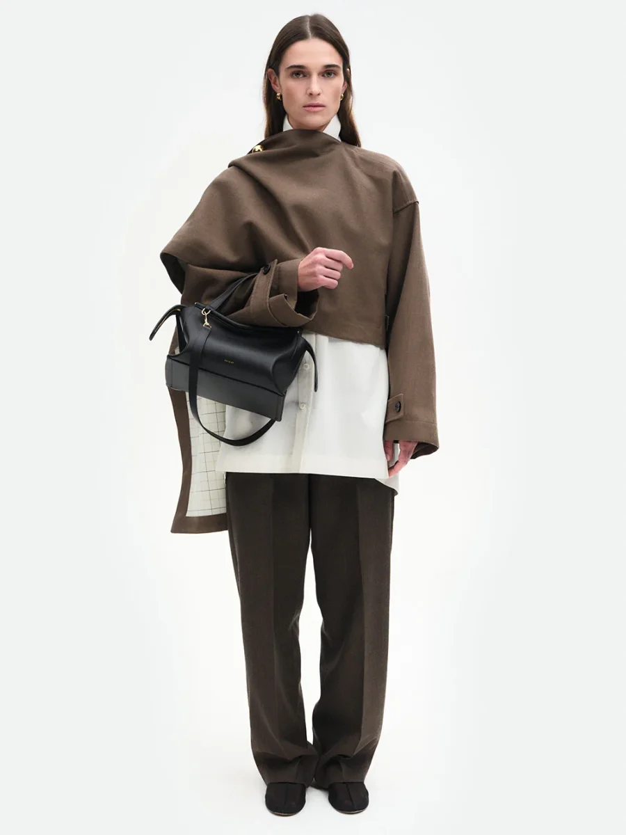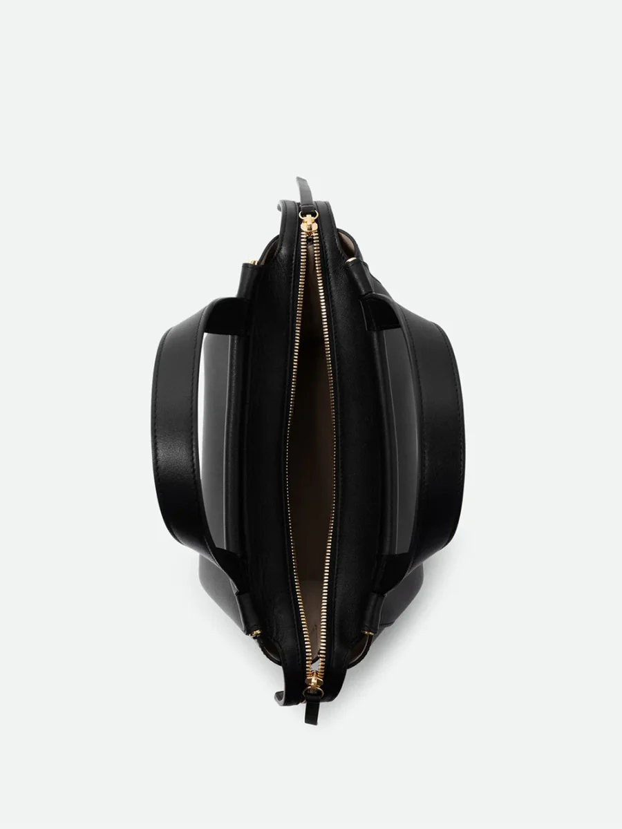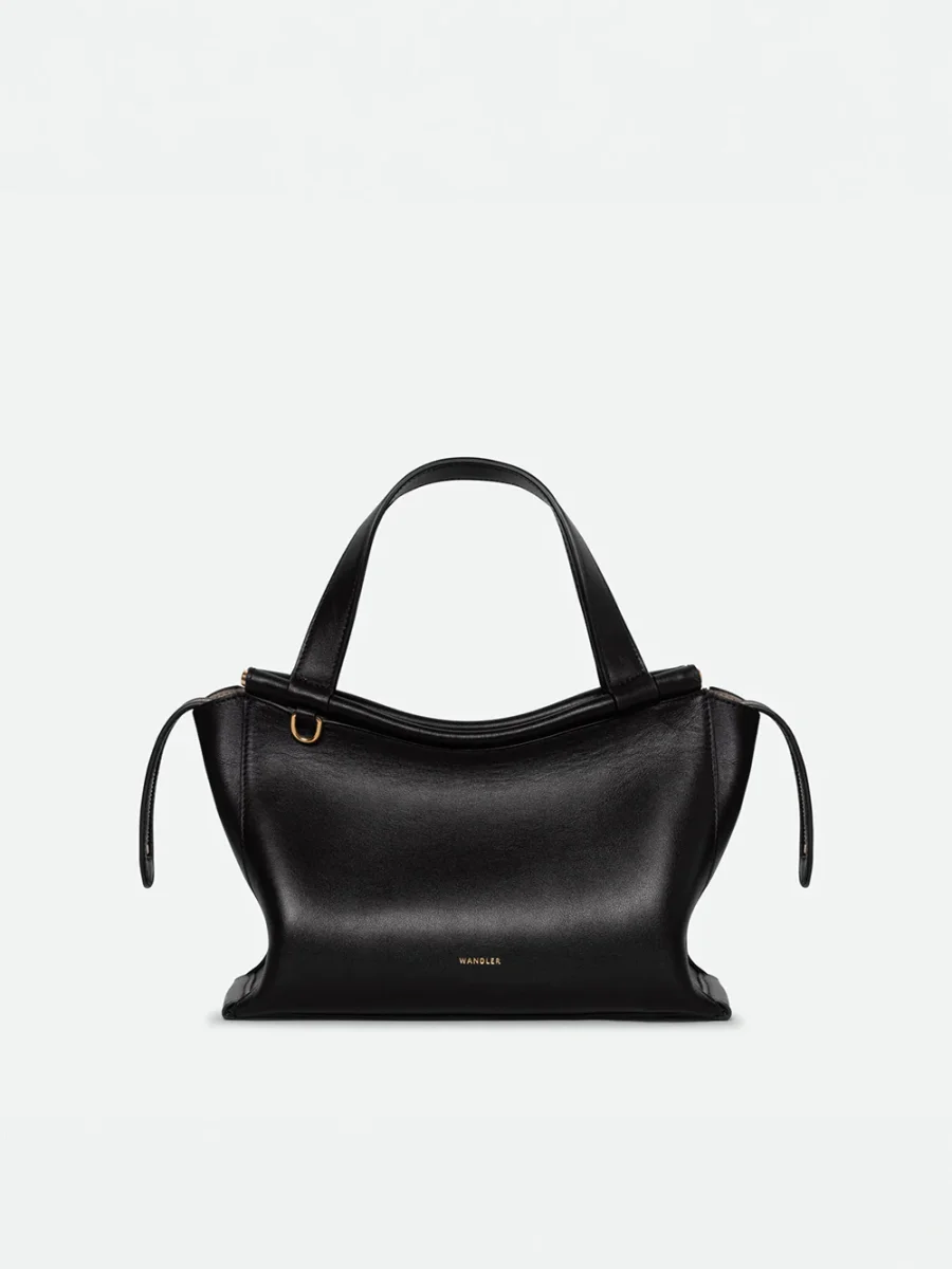 Sac Ida signé Wandler confectionné en cuir d’agneau noir. Un sac à double hanse accompagné d’une bandoulière amovible. Intérieur en suede et finitions métalliques dorées.