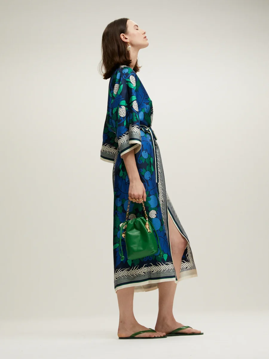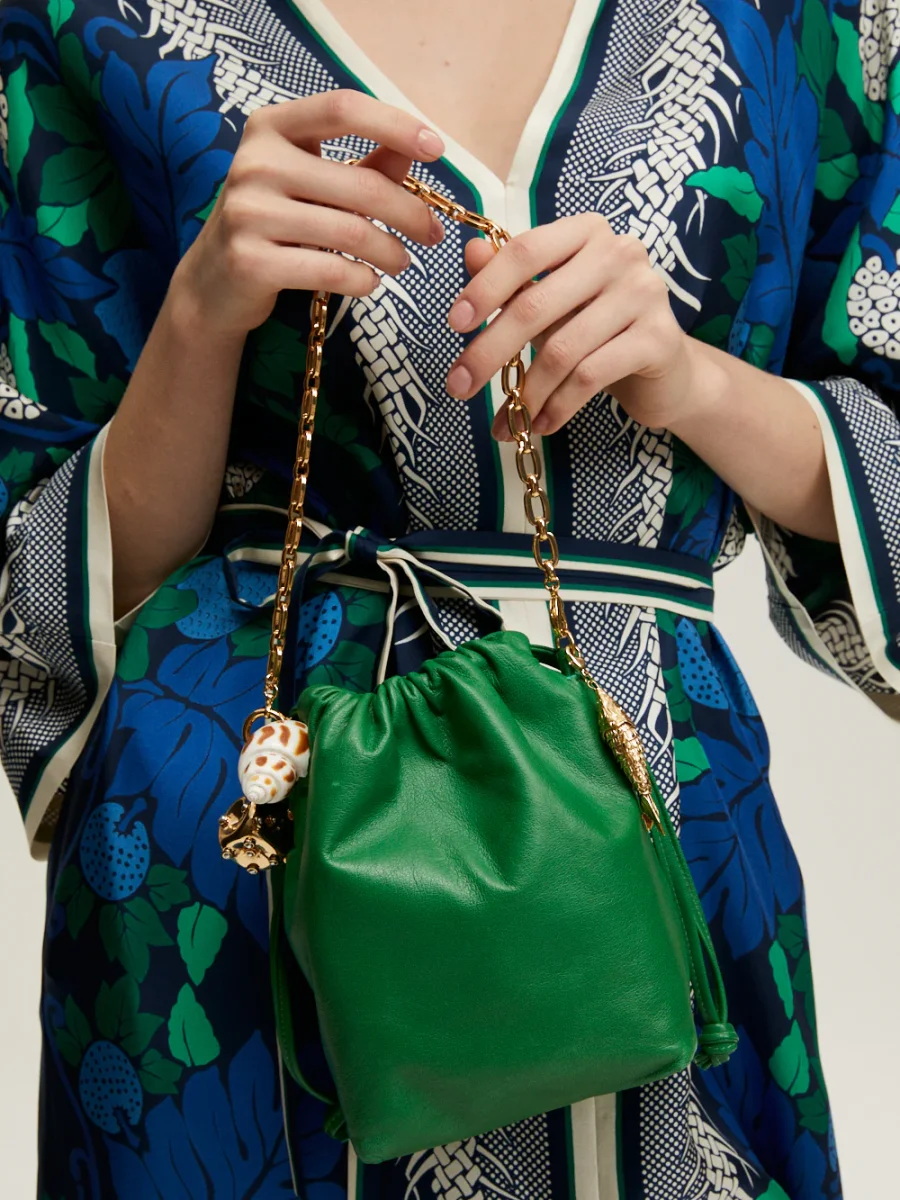 Sac Inaya signé BY Marie Collection confectionné en agneau plongé de couleur vert émeraude. Un sac seau en cuir upcyclé décoré de grigri dorés à l’or fin.